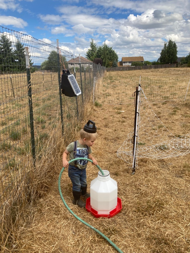 Super easy to do the chores. Just put the feed in the feeder put the water in the water and move the shelter one length forward.