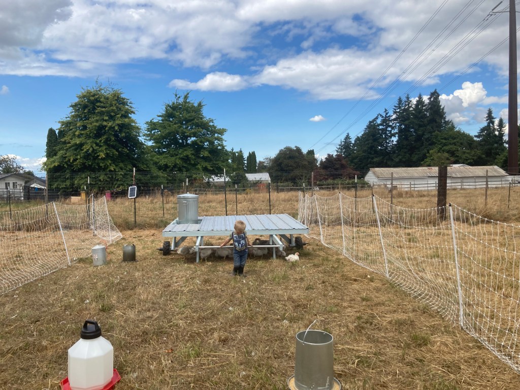 Long-term, we will probably end up building a different style of chicken tractor that is completely enclosed and relies on the physical barrier to keep predators out. Since the shelter that we are using now was built completely free with scrap materials, Thanks to Papa, no great loss there.