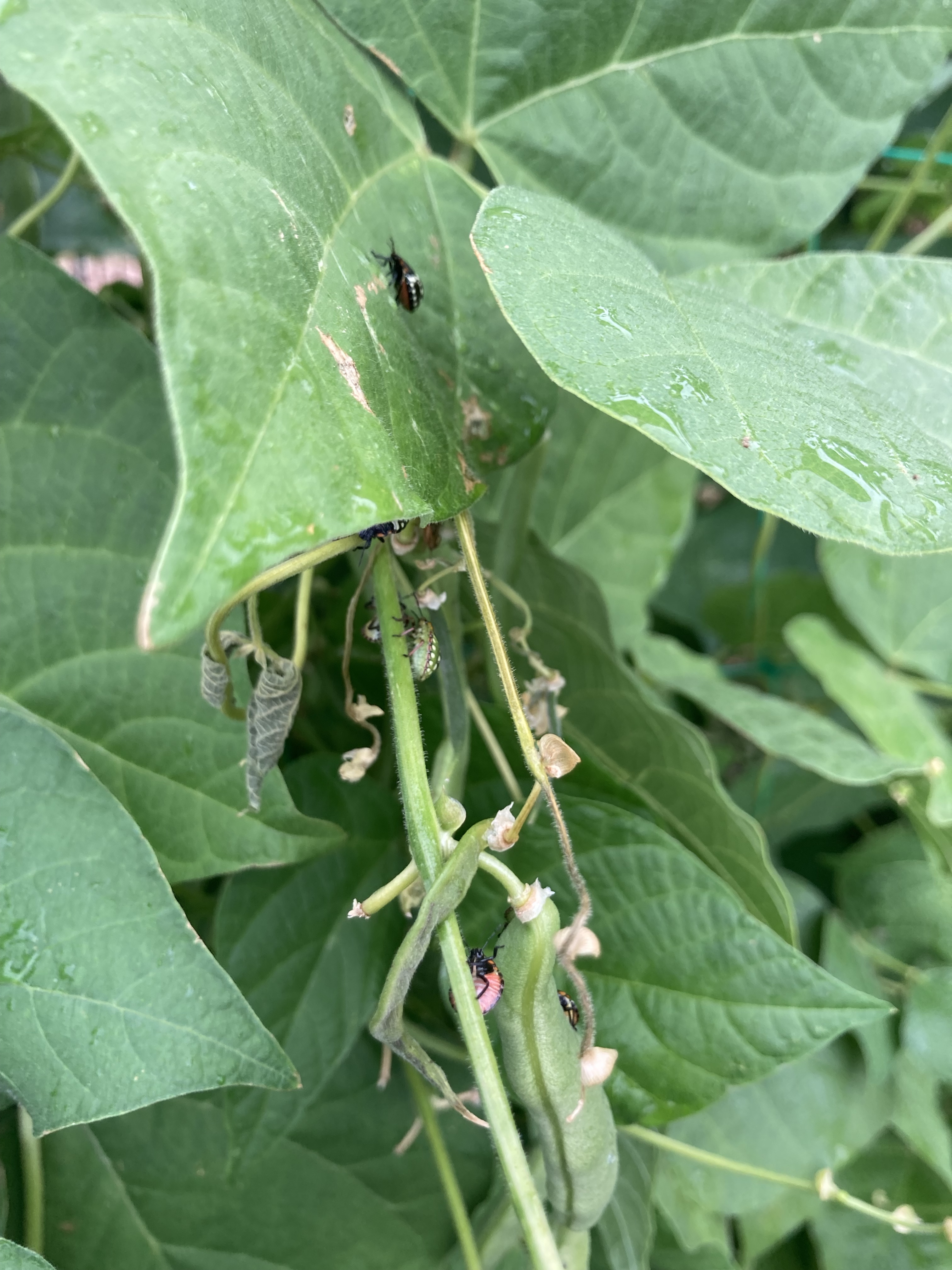 Beans continue to flourish, despite the presence of these little guys. An internet earch reveals they are probably southern green stink bugs.