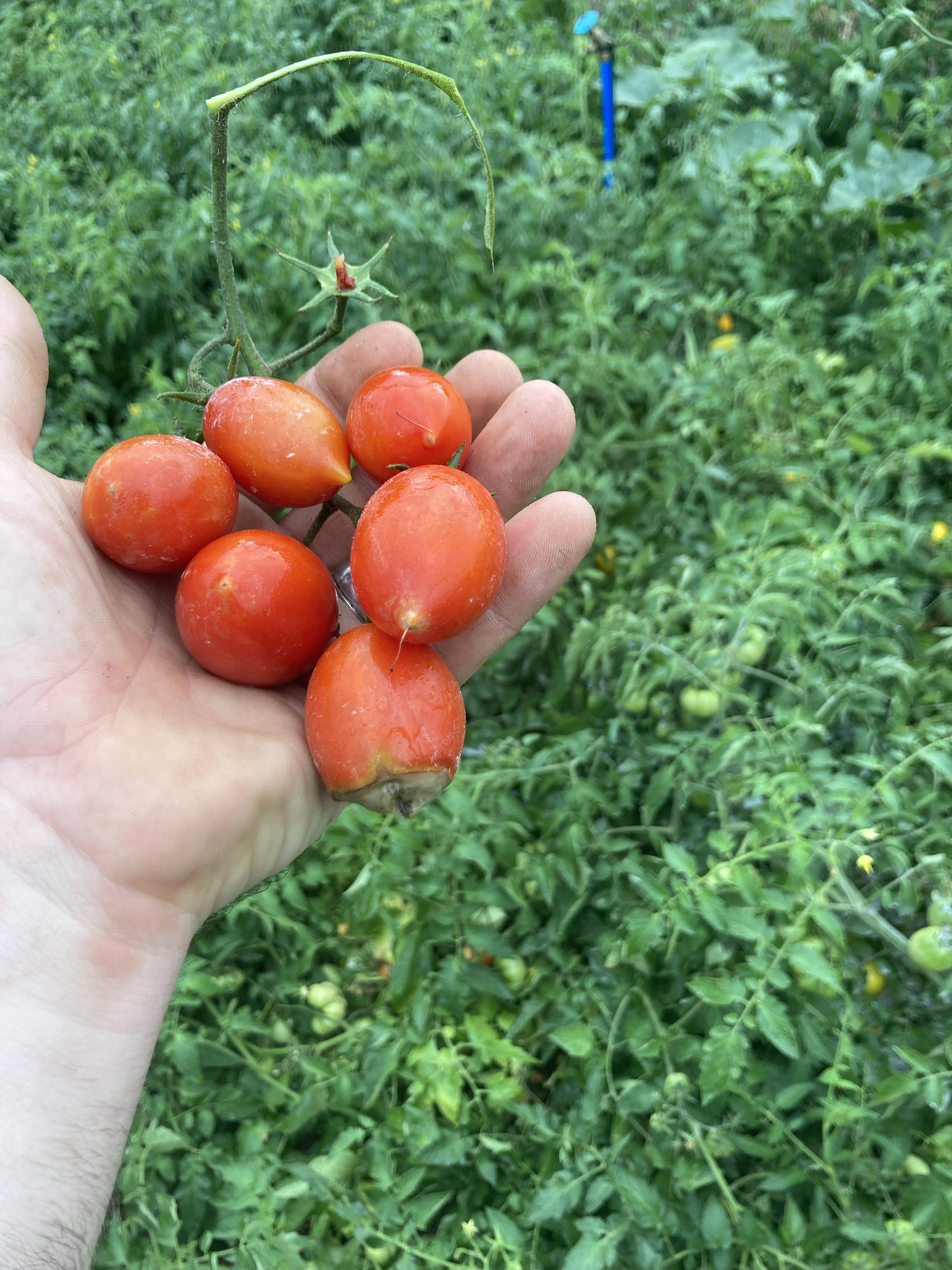 A pretty typical example of early end rot (the oldest tomato at the end) followed by adequate calcium supplementation. The problem is that the calcium wasn’t consistent to all the roots of all the plants. We’ll hit it again.