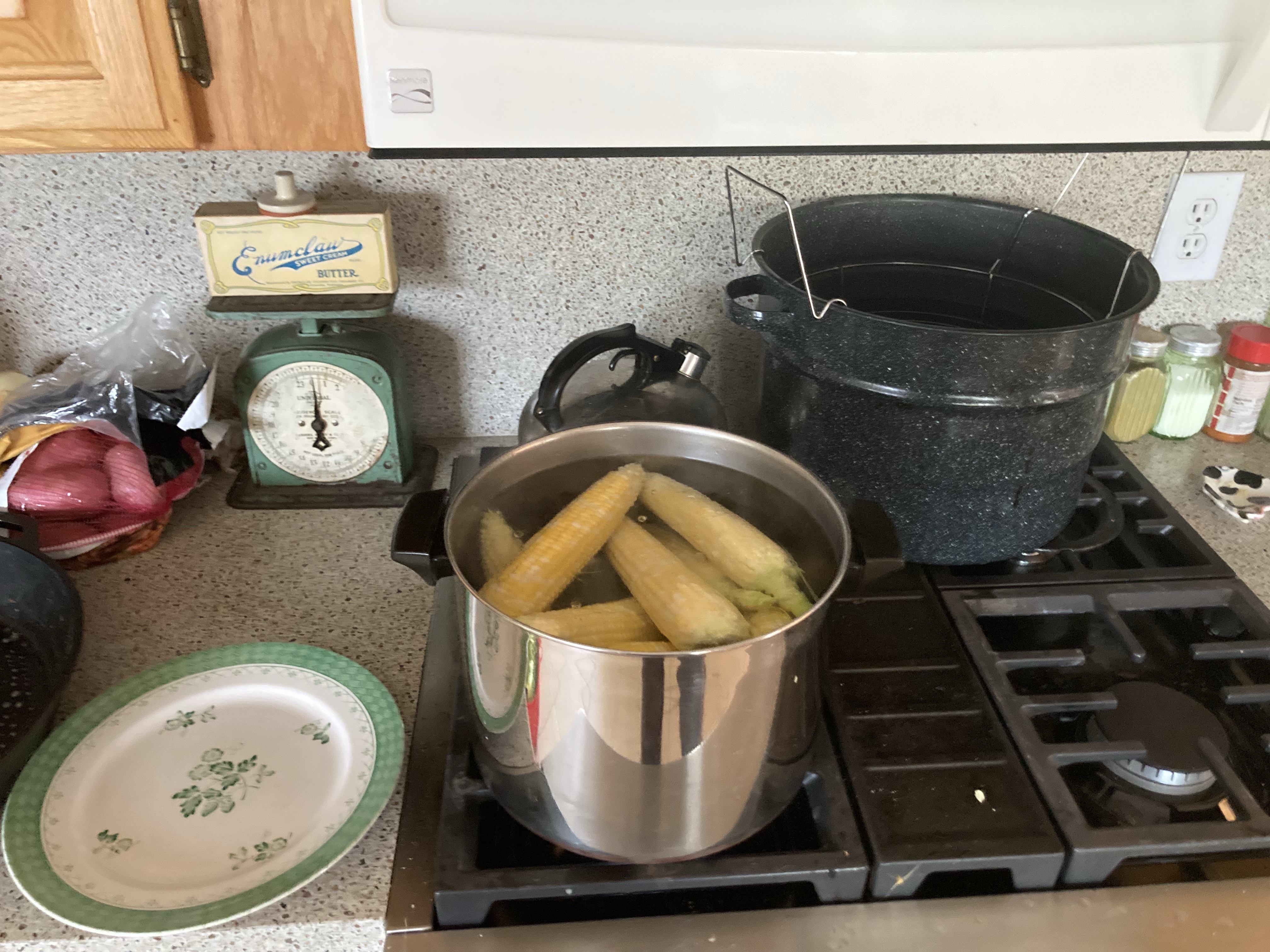 Let the canning begin. One batch through the two pressure canners simultaneously. This is why Kathleen has two pressure canners. With 15-20 minutes of warmup time, then 25 minutes of processing time, then 10-15 minutes of cooldown time, if she had to do two separate batches it would be a very late bedtime.