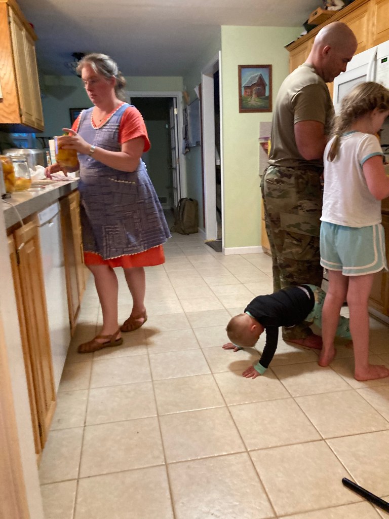 To make mommy’s job just a little more entertaining, we still have the two boxes of peaches that Seppi and Deedee and Papa picked on Monday. They had not even been close to ripe on Tuesday or Wednesday, the days we expected to can them, and Saturday we just had way too much going on.