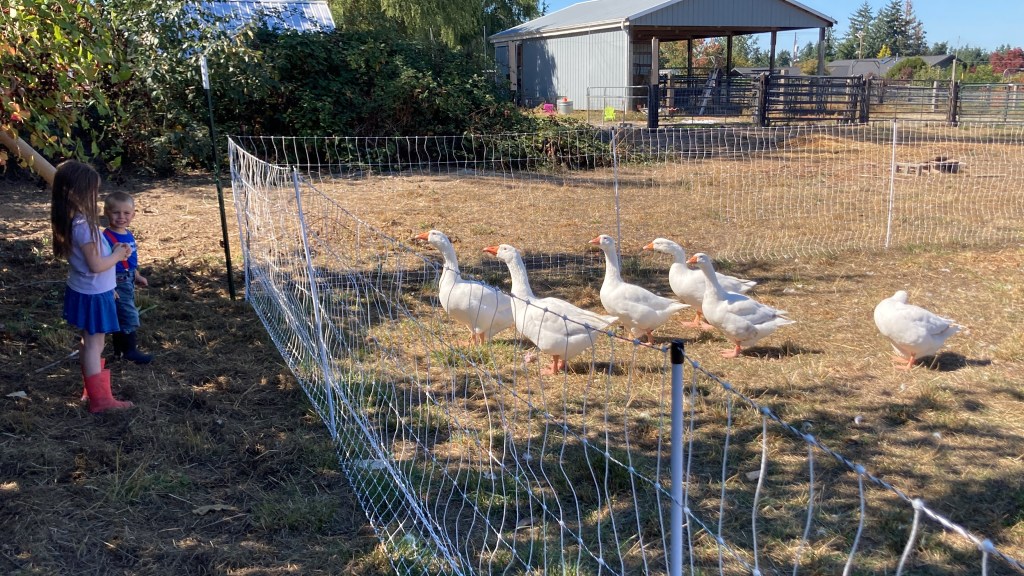 Watch geese are always on watch. They come on in honking, hissing, waddling gaggle, with the two big ganders in the lead. The kids are a little scared of them, but they are really just big bullies who waddle away if anyone comes rushing at them.