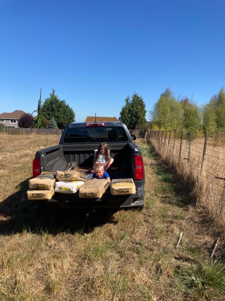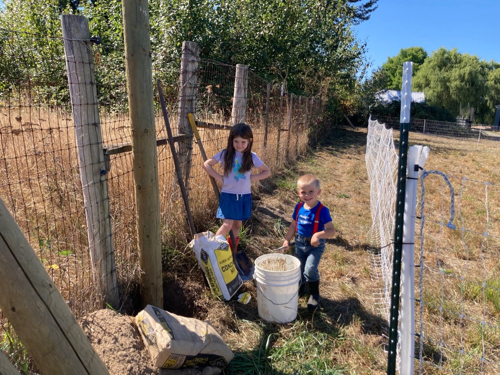 Finally got back out in the field with the two middlest kinder, and we were able to get the last of the main wooden posts in. This perimeter fence has been a work-in-various-stages-of-progress since we bought the place. We have been really pushing to get the perimeter fences fixed and finished, so that we can start purchasing the larger stock that are going to form the heart of our pasture management strategy, but with harvesting and preserving going on, on top of still having to work, it’s slow going.