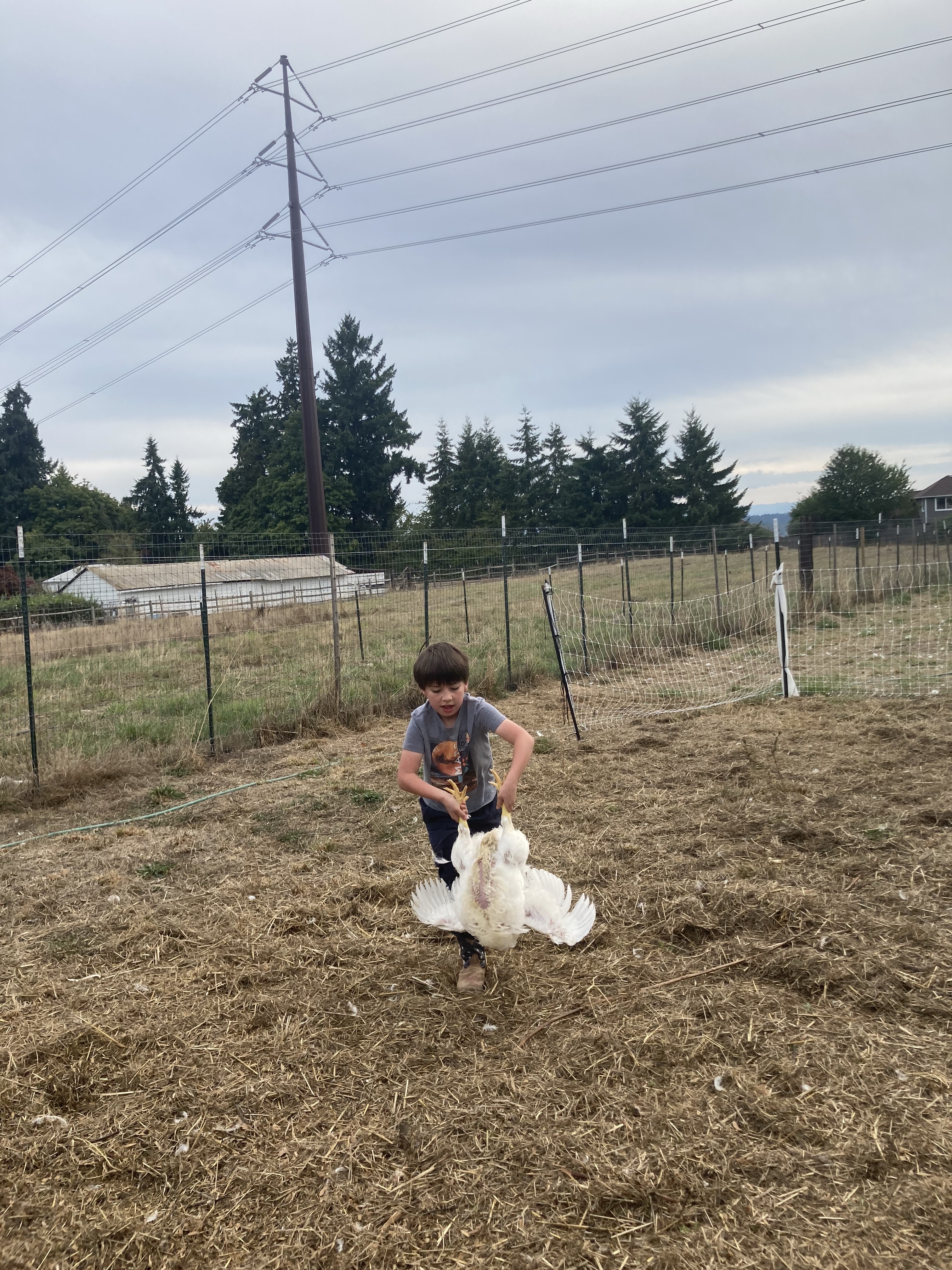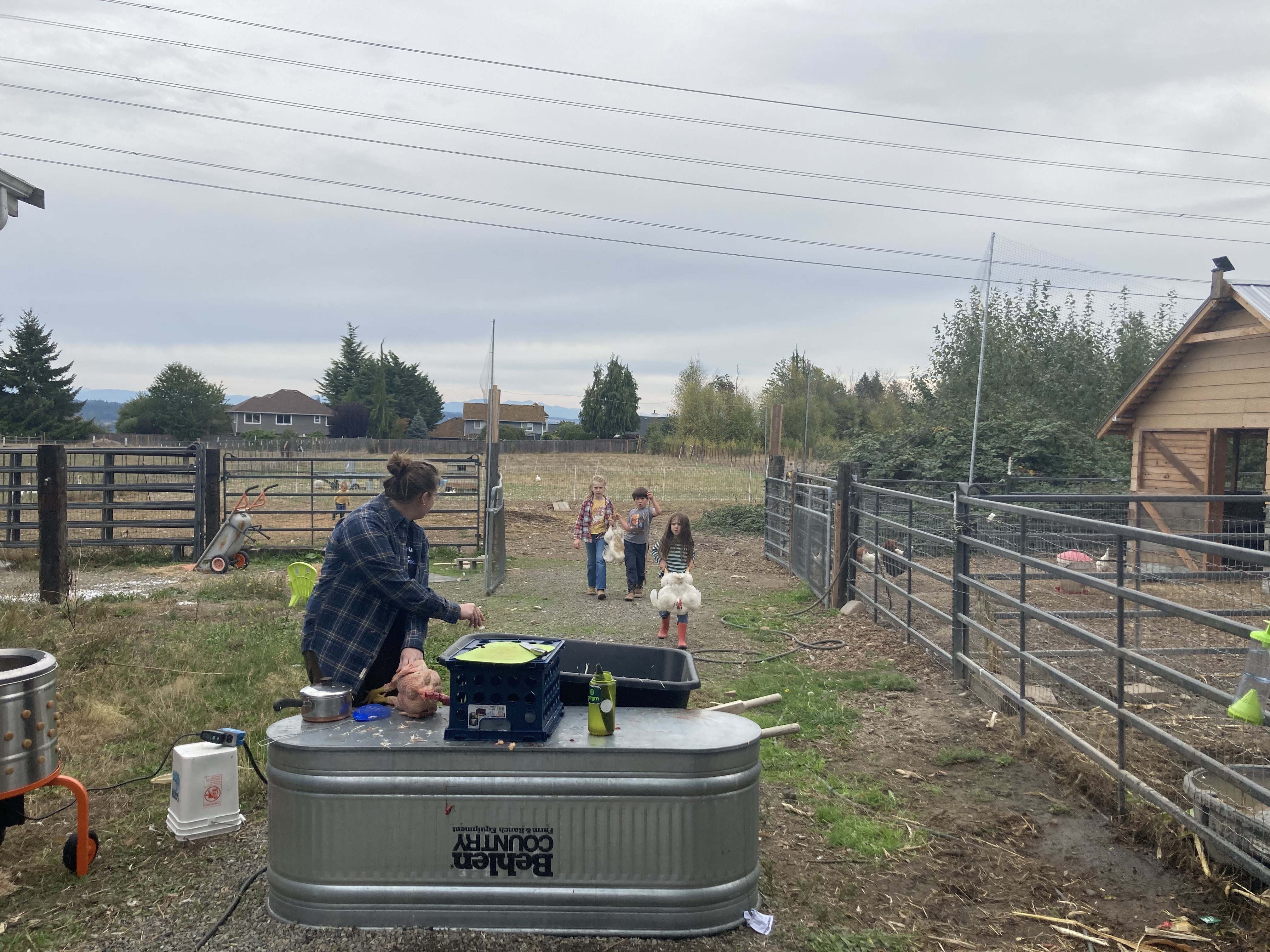 How longest part of the set up was waiting for the water to get up to temperature. Once everything was ready, then our intrepid chicken wranglers had to make their way past the guardian geese to grab the chickens off the pasture.