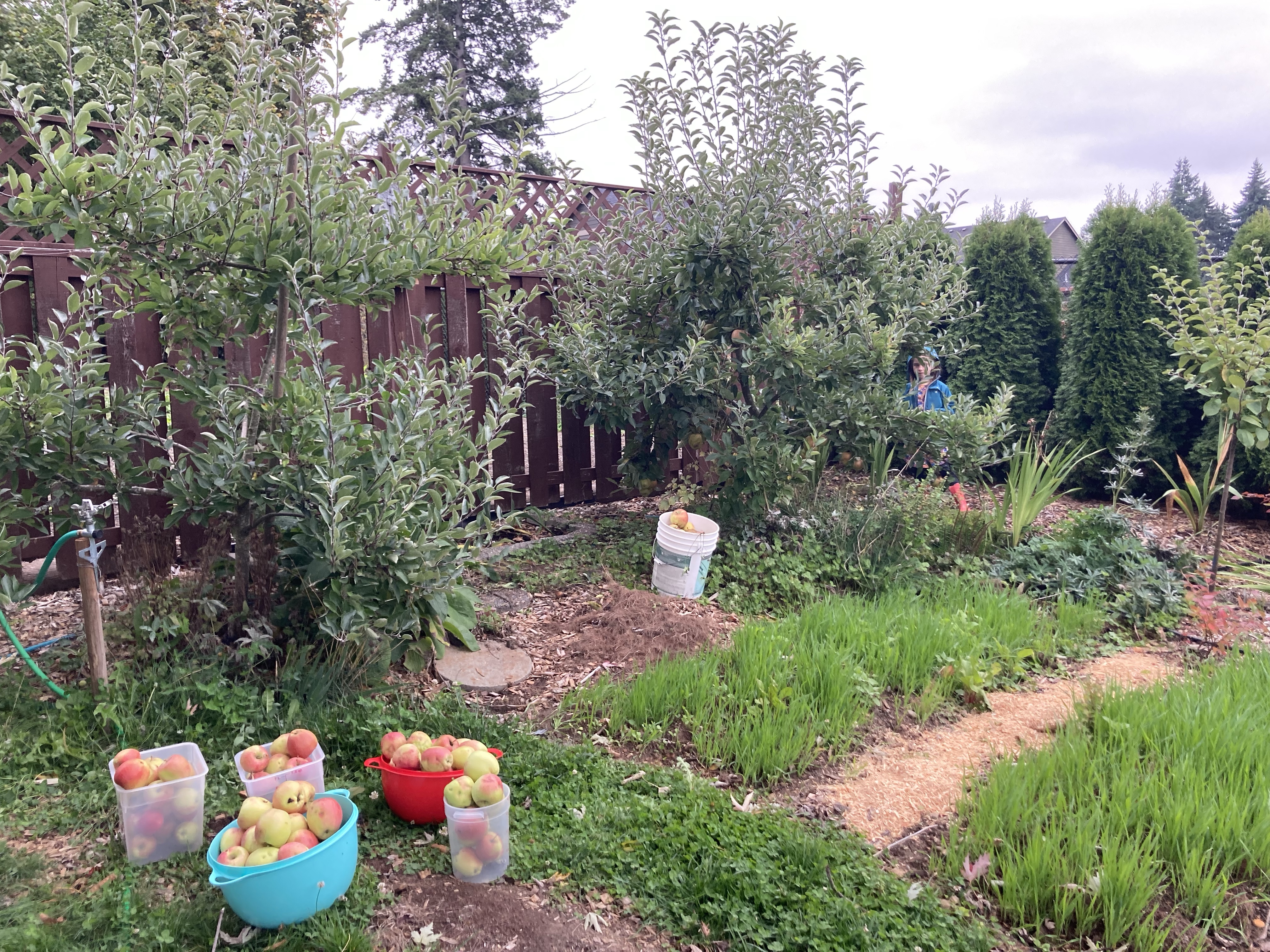 Maybe next year we will do something about the moths, and replete the calcium. All those apples are just the good ones off the little tree. The big tree to the right is still untouched. All the windfalls are in the white bucket for eventual distribution to our feathered friends.
