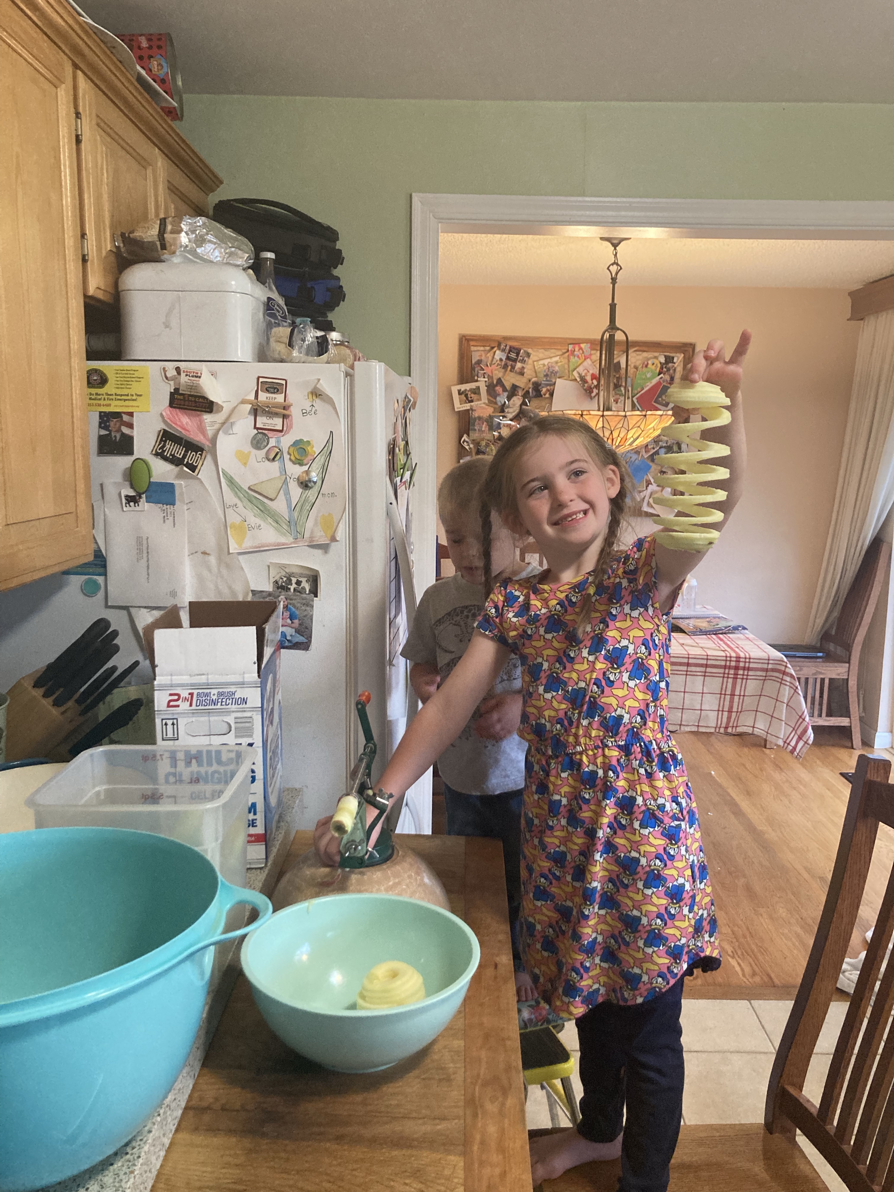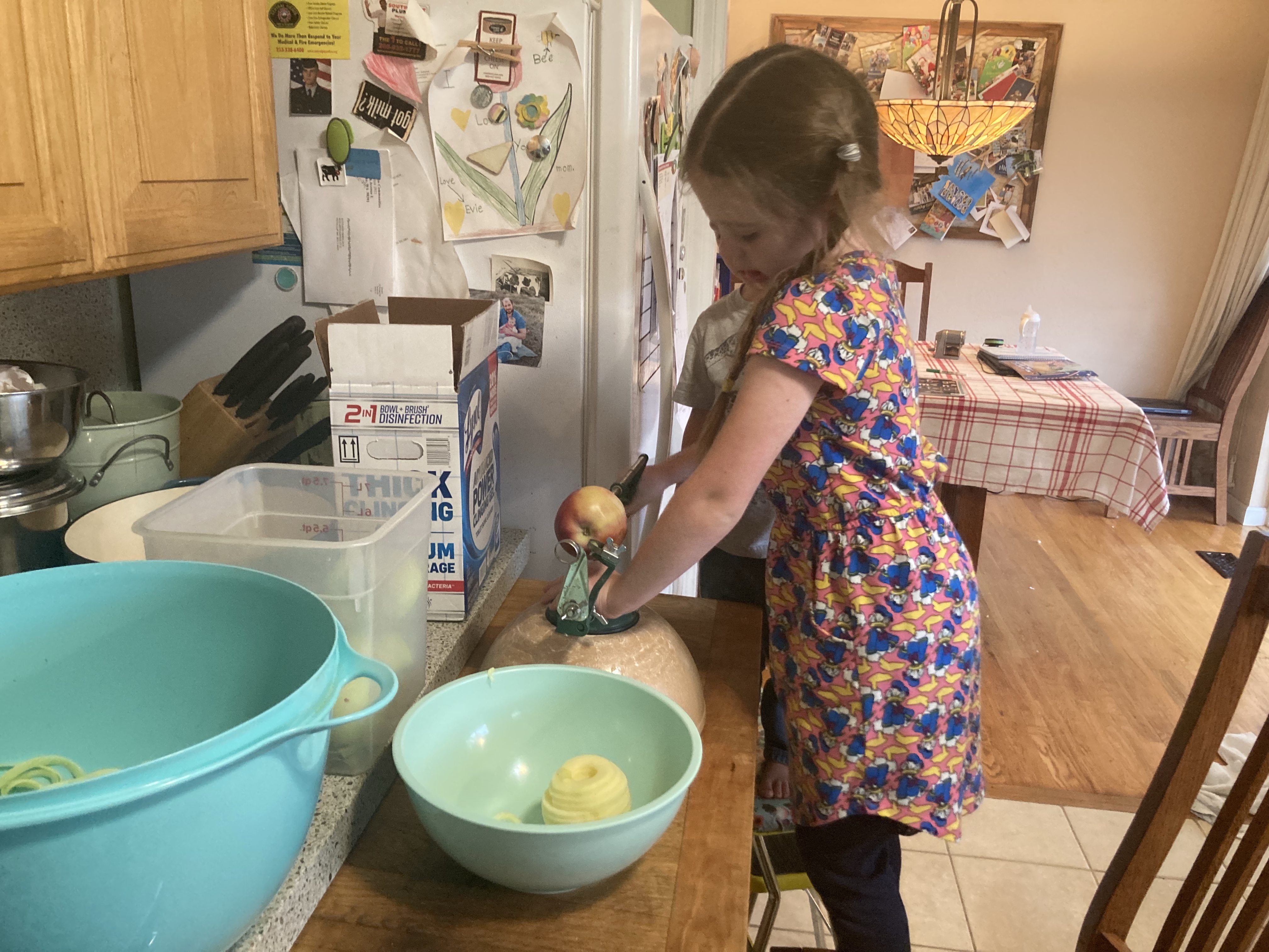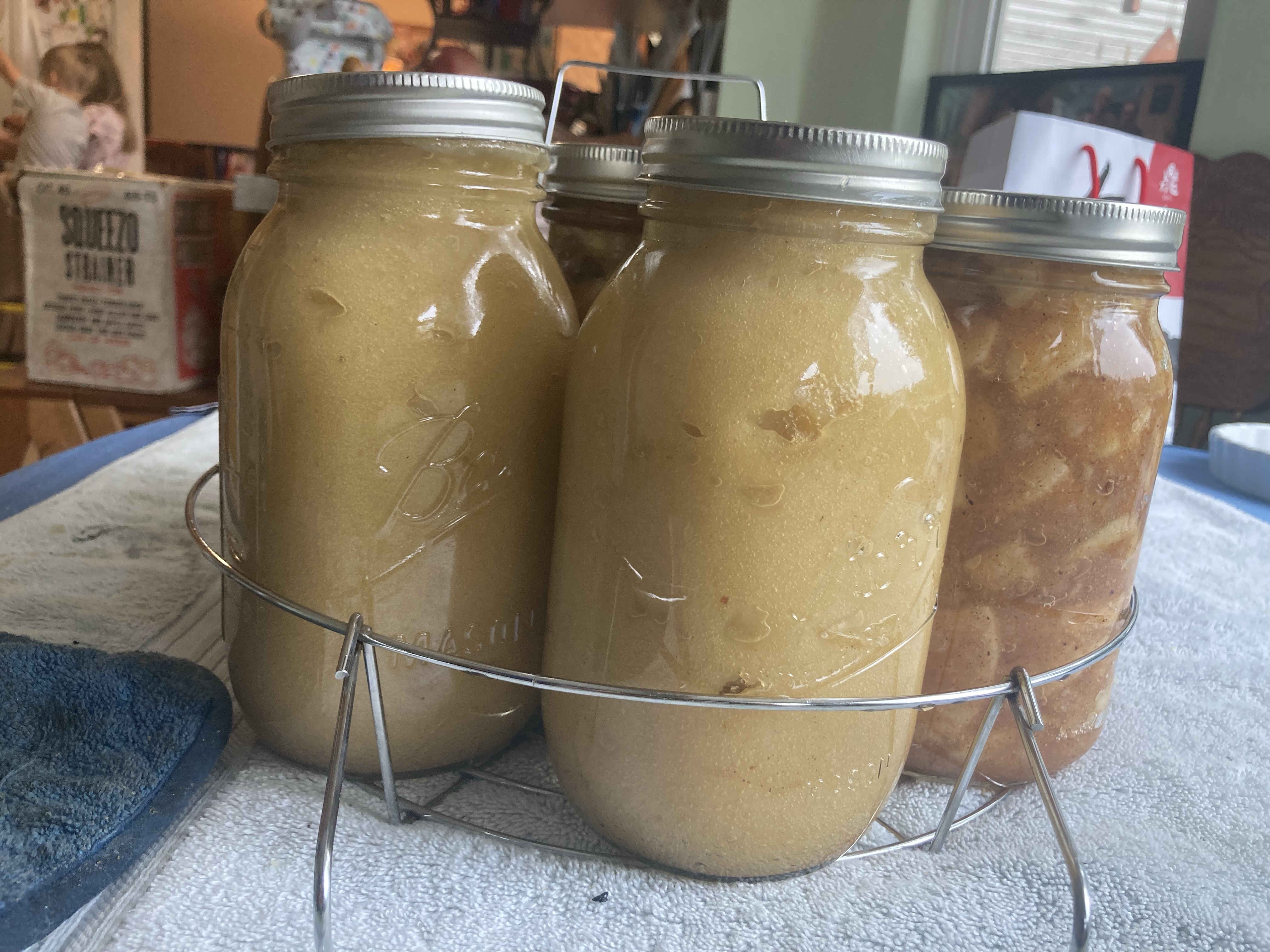 Unfortunately, we forgot to take a picture of the finished haul, but it was 13 quarts of pie filling, 15 quarts and 9 pints of unsweetened sauce and six pints of sweetened sauce. And we still have a box of apples and a whole tree of apples that we haven’t even touched yet!