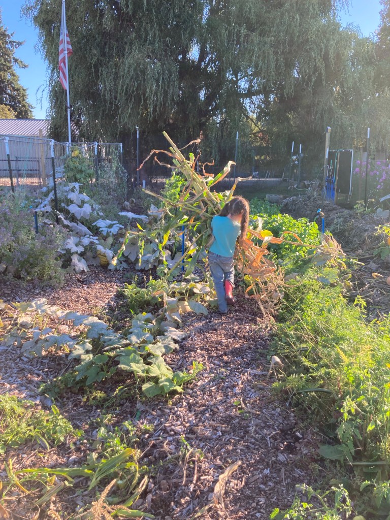 Toward evening we cut down the corn, and ran the stalks through the chipper. We pulled the remaining ears off (there weren’t more than two well-formed ones, we had eaten all the rest), to dry out in the shop. Eventually we will feed them to the chickens. The leaves and shredded stalks we put on the compost pile. Incidentally, running green corn stalks through a stick chipper is not as easy as you might think. All the kids had to…