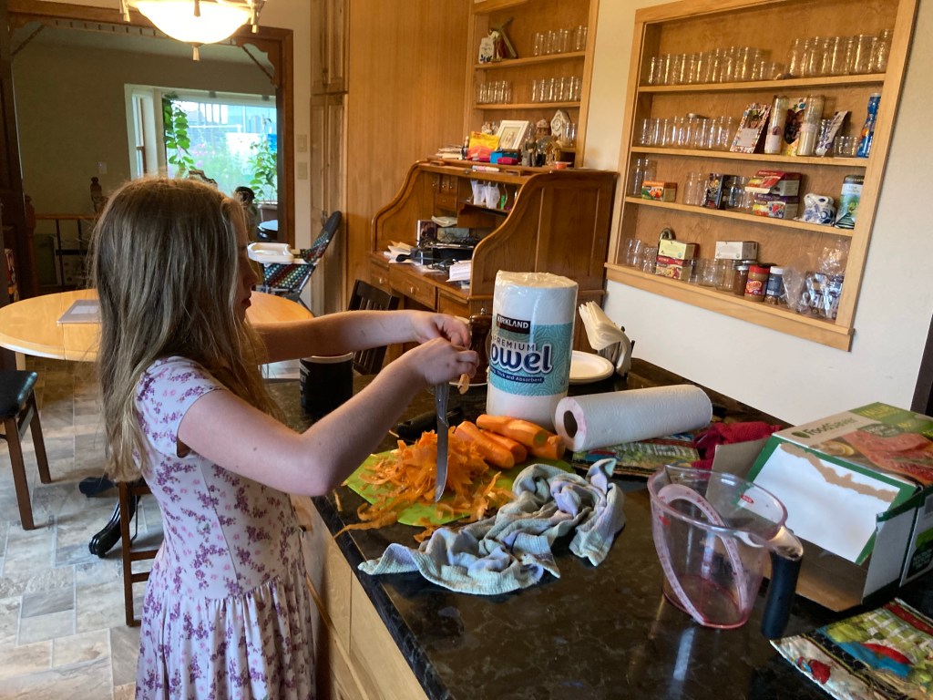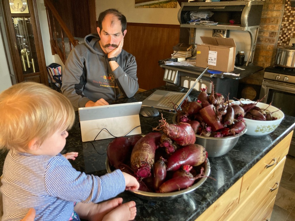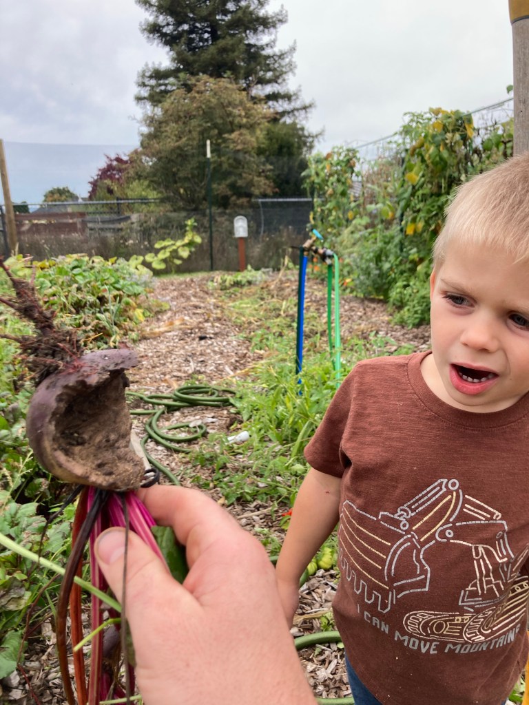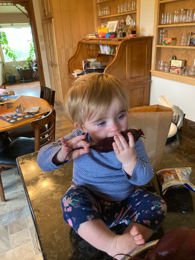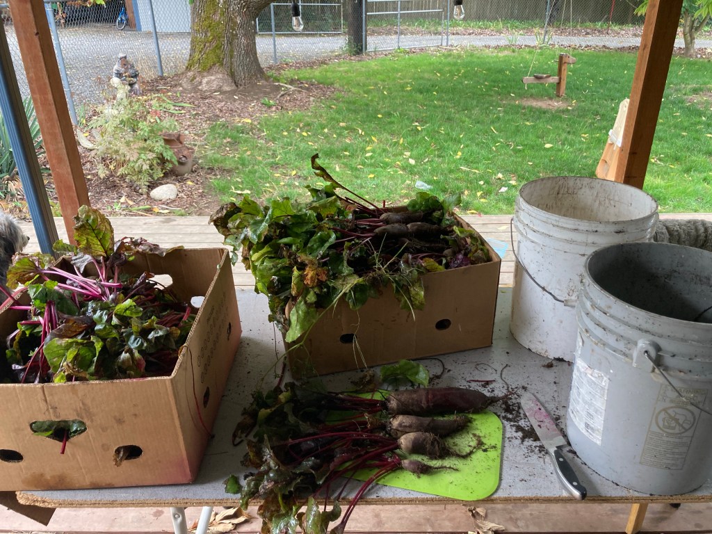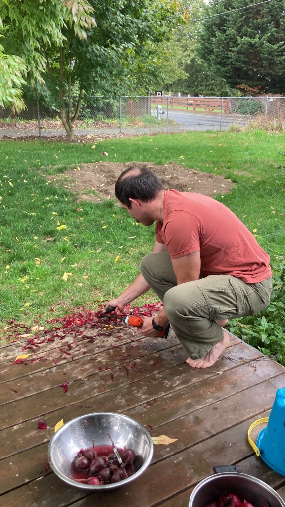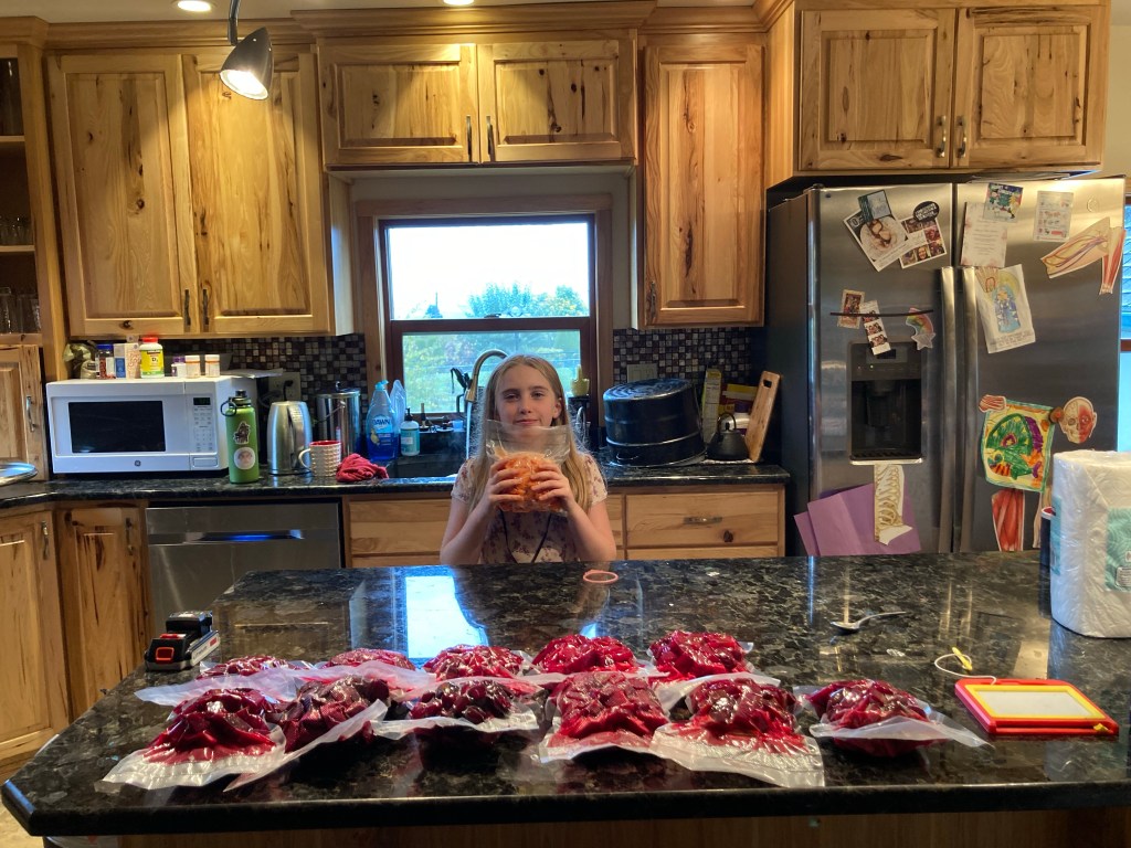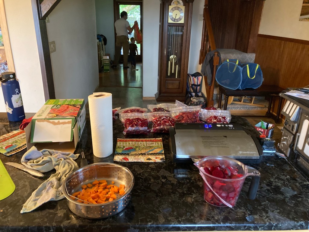 Cool, wet, drizzly day. Getting to the end of the farming season.Apparently, we have a problem with voles.The size and quality of the beets was extremely inconsistent.Uncle Adam, hard at work doing school.YummyLife is better with a Power ToolsIt’s a fairly simple process to blanch, vacuum, pack, and freeze. It just takes time if you only have one person doing all the steps and sequence, rather than several doing them simultaneously.When Evelyn finished her school, she decided to run out to the garden and dig up some of her carrots.Is this for Winnie?11 quarts of beets and 1 quart of carrots, ready to go in the freezer. Evie is very proud of her carrots, she planted, weeded, harvested, processed, and stored them all by herself. The only part she did not do was actually putting them in the hot water and taking them out by herself, just because she’s not tall enough to reach the stove.
