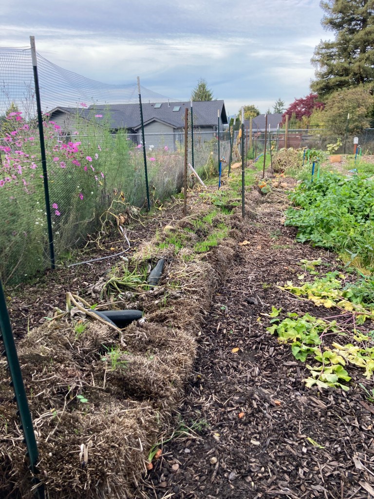 However, we realized that we were taking the tomatoes and squash out of the straw bales, and one of the things that grows well in the straw bales are wheat and oat stalks from leftover seeds. So we decided to seed one row of wheat into the straw bales after we pulled the squash and tomatoes out.