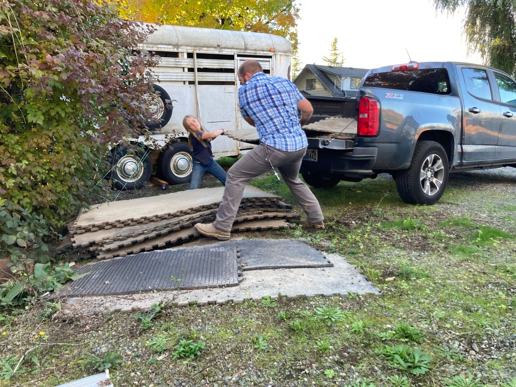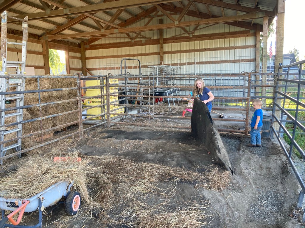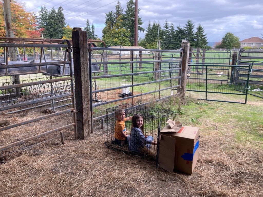 First step was removing all of the old horse pads that the previous owner had installed. We are not fancy enough for such nonsense. Dirt is good enough for our pigs. Then we pulled up the layer of landscaping fabric. We discovered that the entire paddock has a layer of landscaping fabric, under 8 inches of sand and gravel. That would be too much of a pain to remove without a tractor, so we are going to leave it for now. I will never understand horse people. Stacking the horse pads next to the shop. They will eventually make a good sub floor under Daddy’s garage gym. It is likely to get cold here this coming weekend, so the piglets need a shelter within the shelter, somewhere they can snuggle into some nice warm hay for body heat. So we are making them a little pig tent. Originally it was going to have a door, but we needed that piece of cattle panel elsewhere, so the don’t have a door now, just a flap of tarp. Help! I climbed up and now I can’t figure out how to get back down!Seppi goes up and down with ease. Mostly up. He rarely comes down as long as there is any remaining “up” to go. Winnie prefers playing in the loose hay. So does Evie. Horse panels are cool, in one sense. And we are blessed to have so many of them that came with the place, but they are a bit of a pain to work with. This one was sitting about a foot off the ground. Fine for horses, not fine for piglets. Lowering it a foot and installing that one length of no-climb was the work of an entire morning. Ever since we read “the Long Winter” this summer, the girls have been obsessed with preparing for a hard winter. Evie was kind enough to twist us some knots of hay like Pa and Laura did, so we can burn them to stay warm if we have to. Again, the gate. Fine for horses, not adequate for pigs. We wrapped the bottom section in chicken wire to make it an effective piglet barrier. Another length of no-climb stretched. Seppi is such a good worker!“Help! We’re trapped! We can’t get out.” They aren’t trapped, and they were getting in and out of this transport kennel all afternoon. Mostly finished. The gate separating the two paddocks can waight for now, since we don’t have any other livestock to keep separate. Later on, when we buy a cow or some sheep or something like that, we will need to put no-climb or hog panel across the gate to keep the two halves separate.