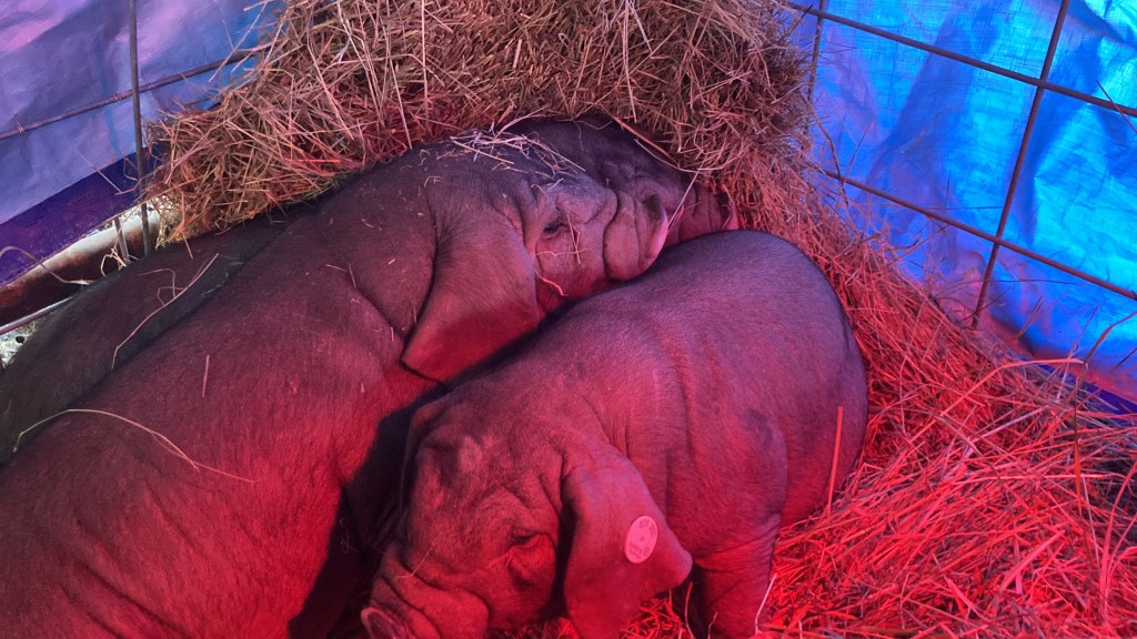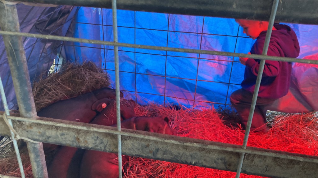 Winnie was very excited to see them at first, but she got scared by their squeals when they were carried over to get their ears tagged and get loaded into the crate.