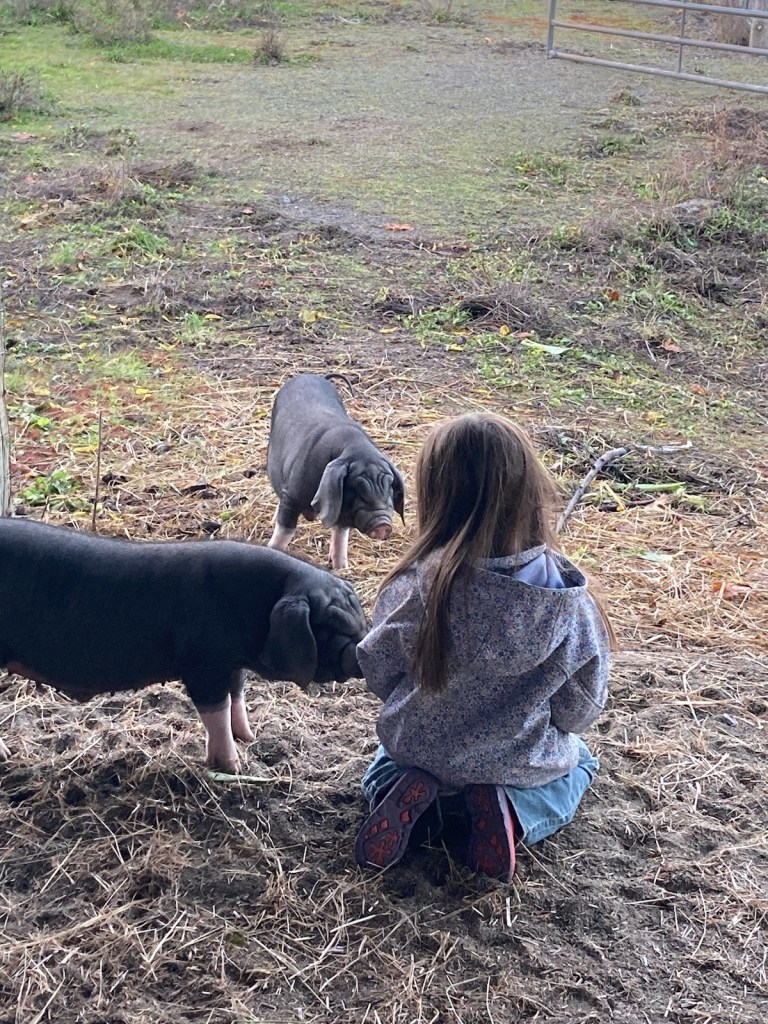 Well, Esmerelda may be still suspicious of the two-legged ones, but the boys, Lard and Bacon, are more than happy to hang out with Ellie…