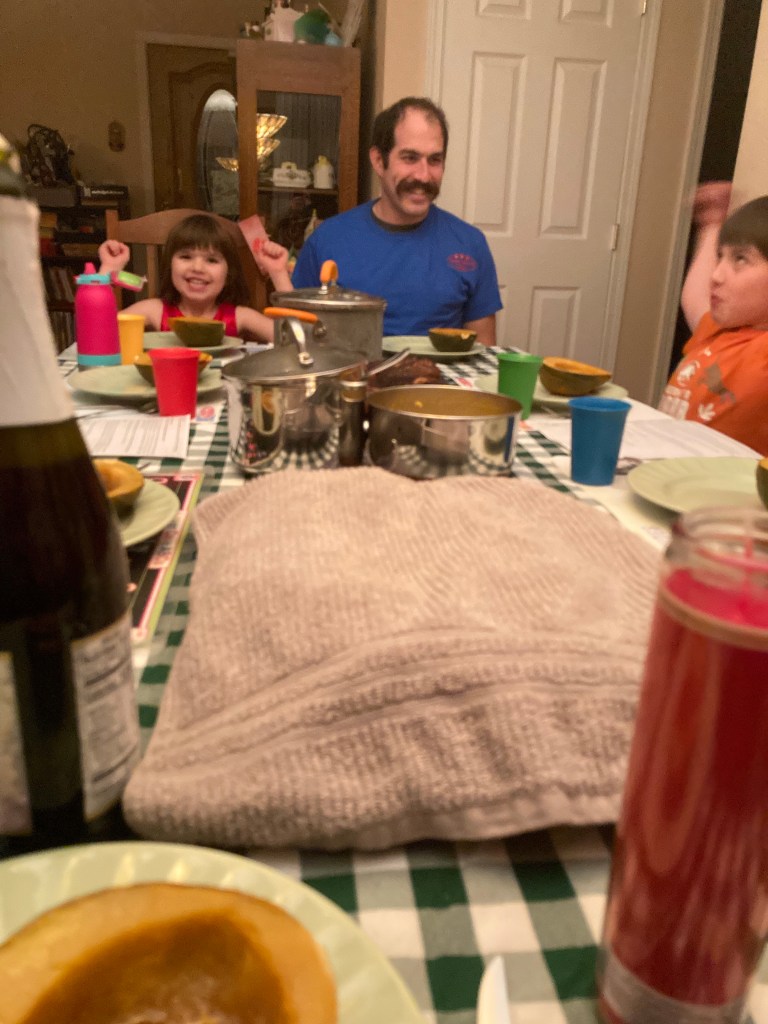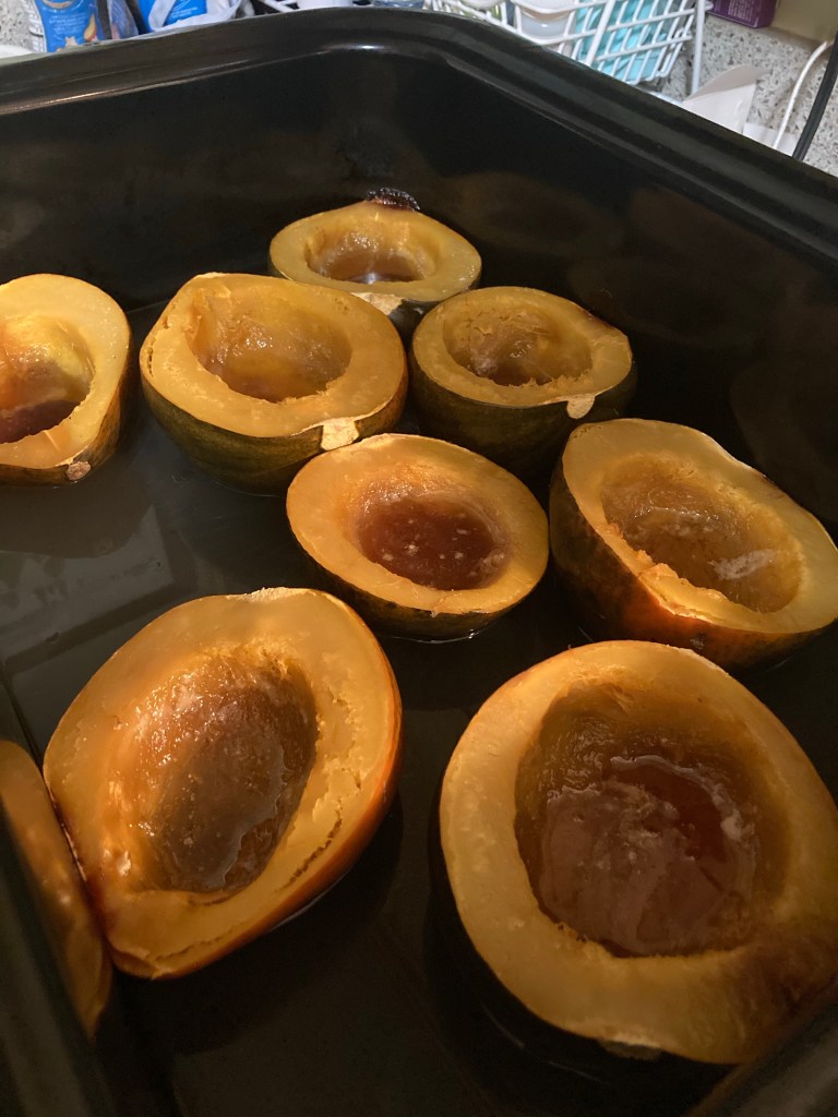 Simply cut the squash in half and scoop out the seeds, careful not to puncture the outer skin. Fill each half with roughly 1 tbsp of butter and sprinkling of brown sugar. As our oven was already in use with the pork chops, we brought out the turkey roaster to cook the squash. Place the squash in skin side down, water should surround the squash at least halfway up. Cook covered at 375 degrees for 60 minutes.