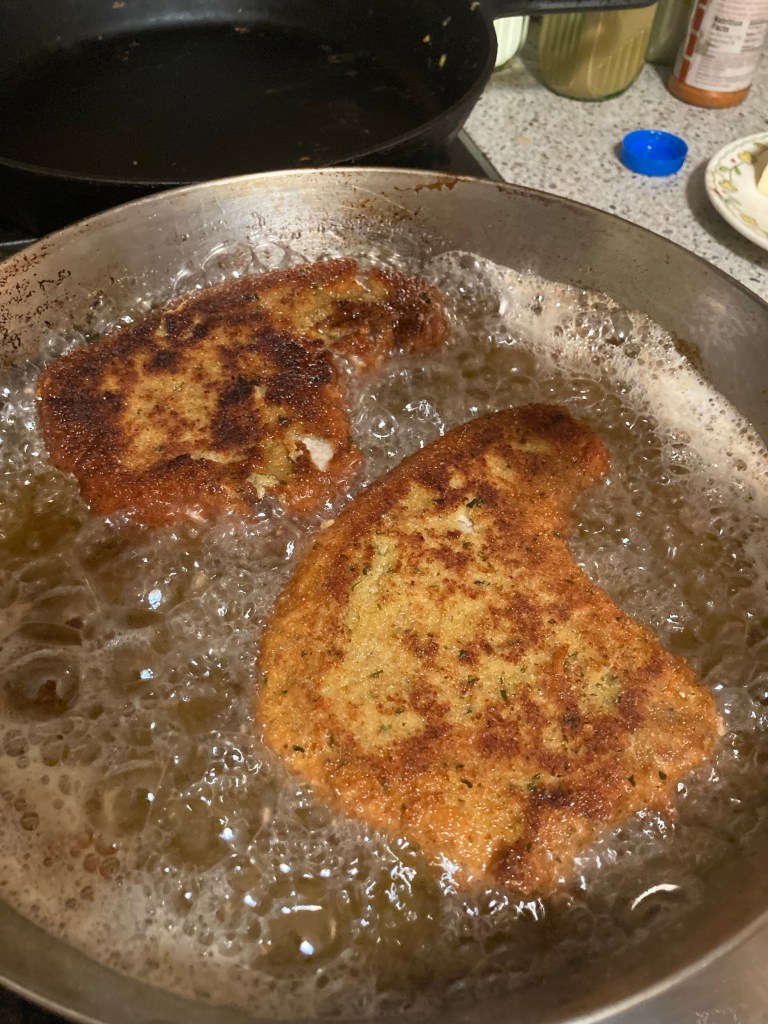 Dredge the pork chops one at a time first in the egg wash then the breadcrumbs. I prefer a thicker coating on my pork chops, I feel like it keeps the meat moist, and the coating stands up better to being pan fried. So, I egg wash, breadcrumb, egg wash, breadcrumb then fry. Since I have yet to have the time to render the lard from these pigs I am frying in vegetable oil.