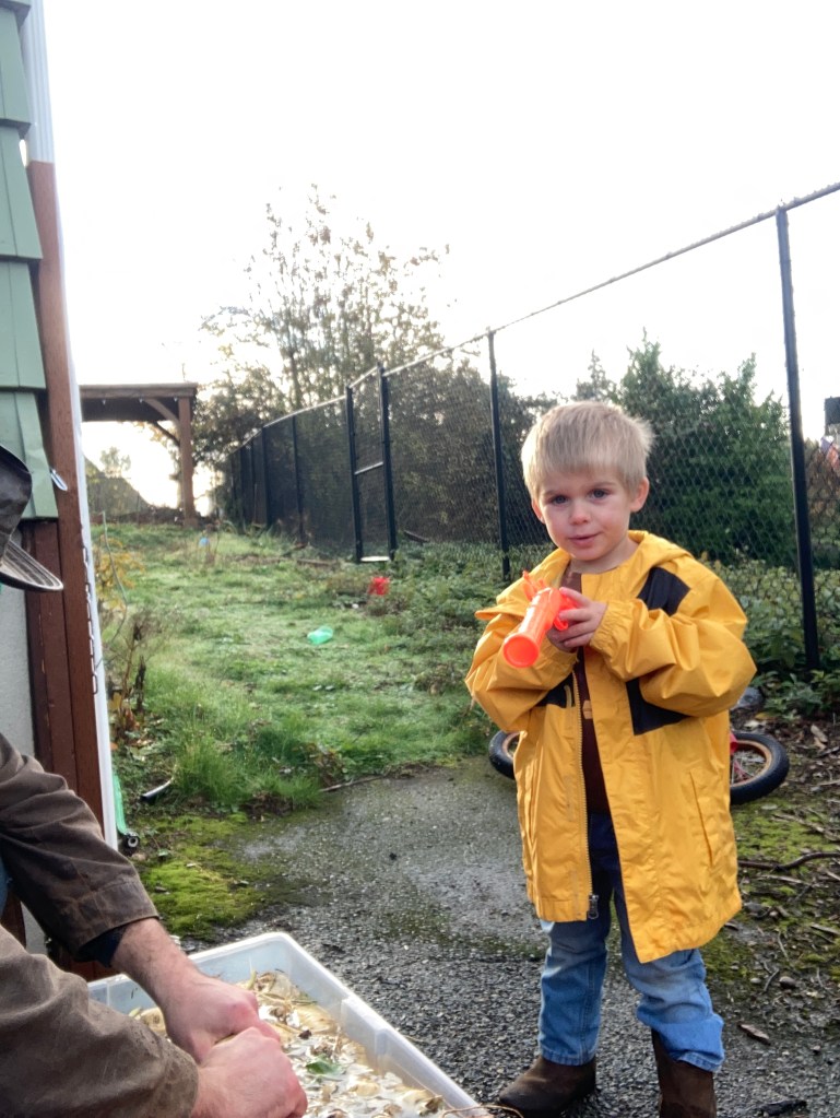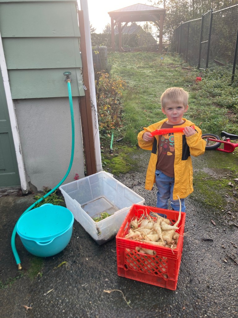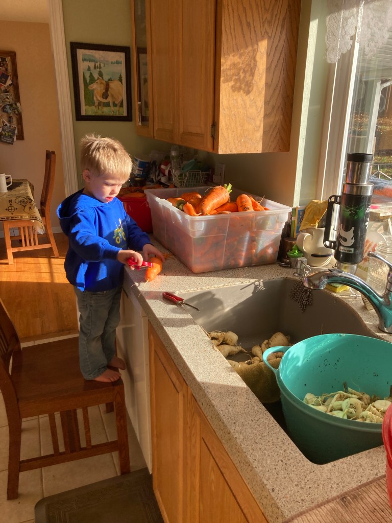 Once inside we had to peel all of those parsnips and carrots. Seppi was very good at this, for a three-year-old.