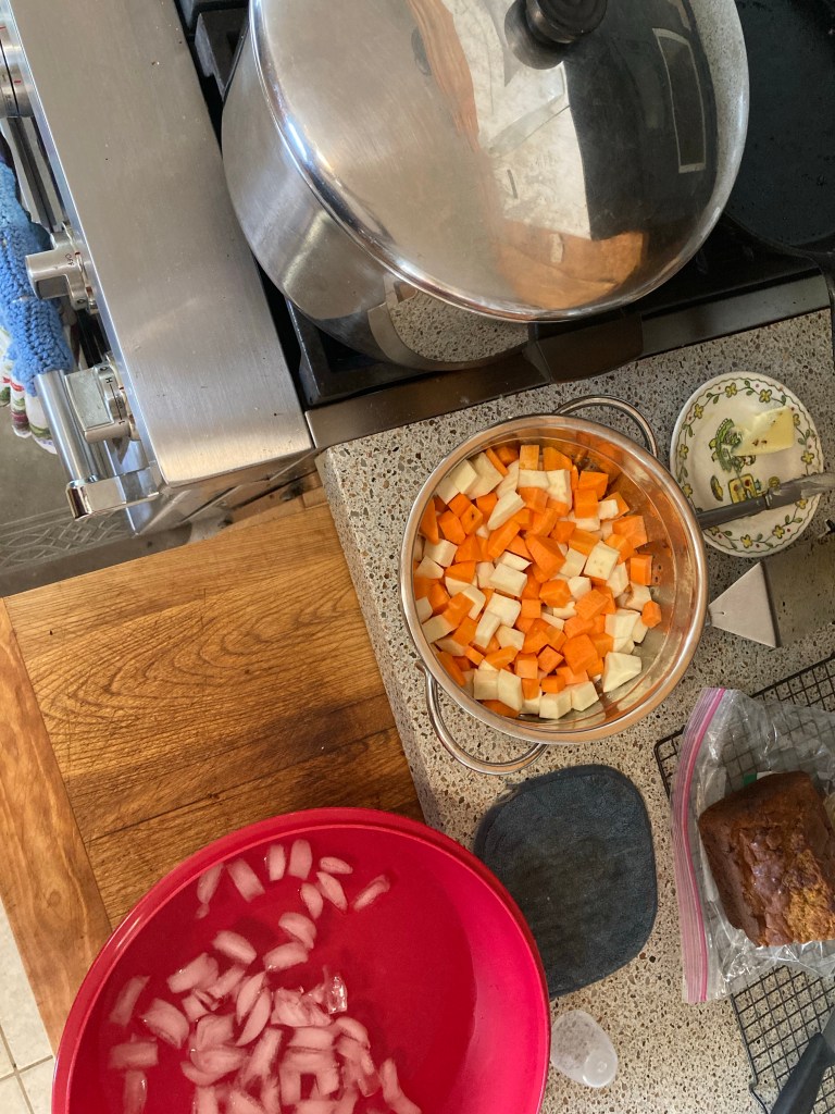 Meanwhile, Daddy was busy dicing them all. We dice a parsnip, then a carrot, then a parsnip, then a carrot, and so on and so forth, until we ran out of parsnips.