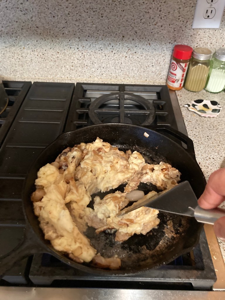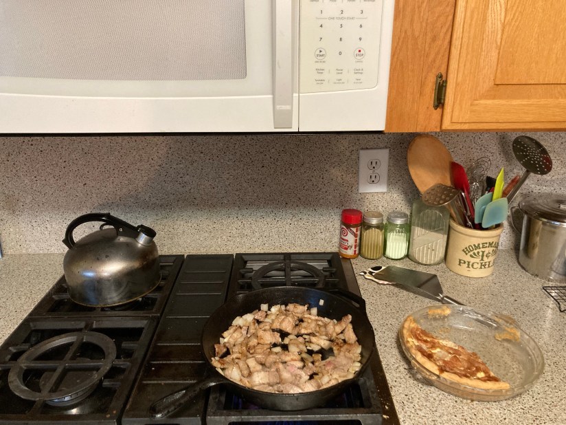 So here is an old time farmer breakfast. Start with four slices of home grown pork belly, and saute’ it in it’s own fat (of which there is plenty) with a medium sized onion.