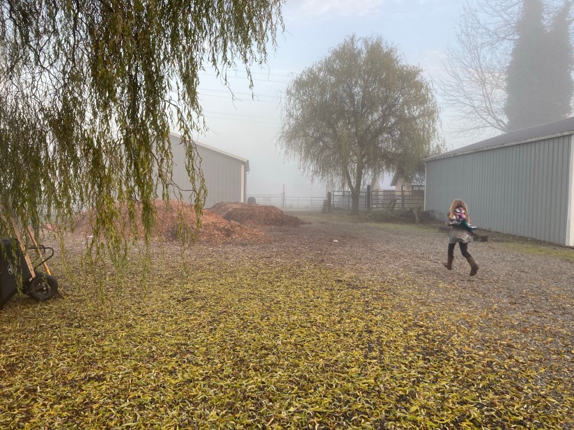 It is perched on a valley overlooking a river (not that you can see the river from the farm, but if you could see it, you… could… see it.) and the fog rolls up the valley and up the hill and envelopes the farm.