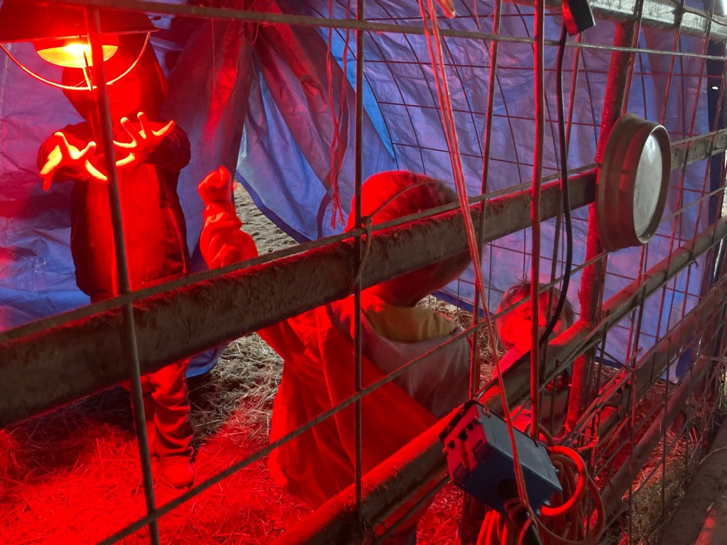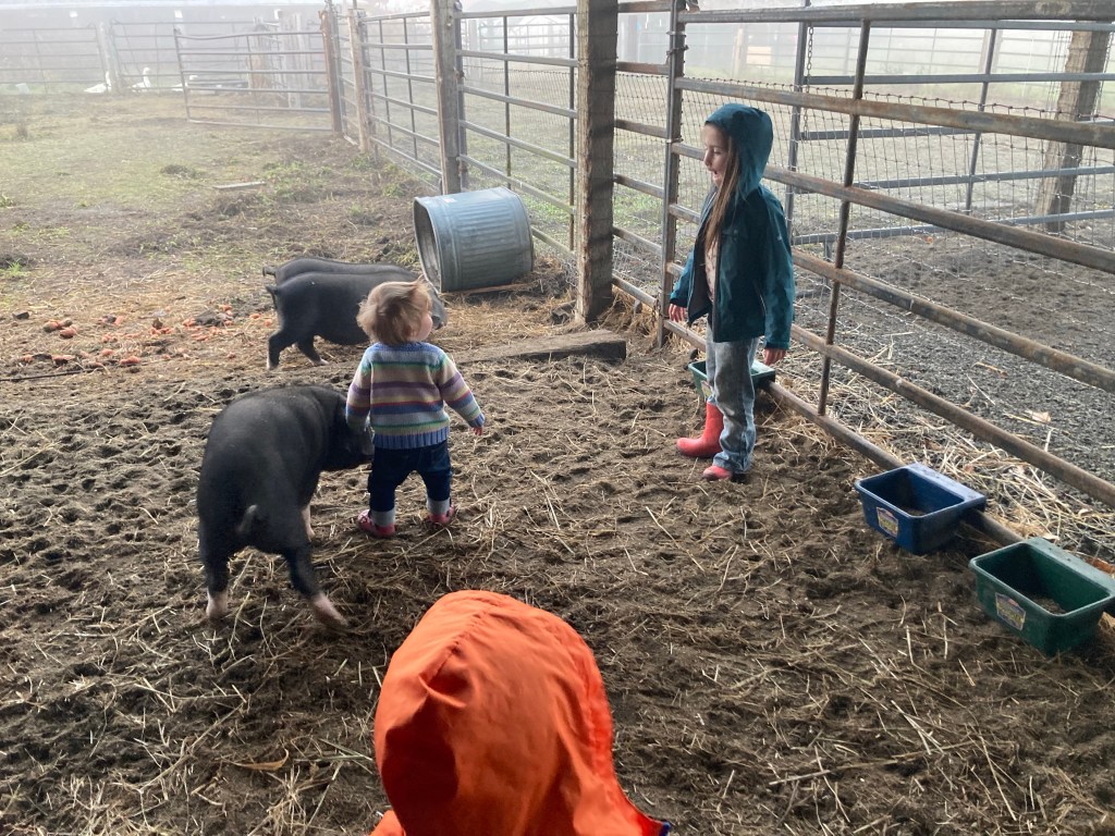 Ellie brought her siblings into the pigs’ homeless shelter to get warm under their heat lamp. Fortunately, pigs don’t poop where they sleep. Unlike chickens.