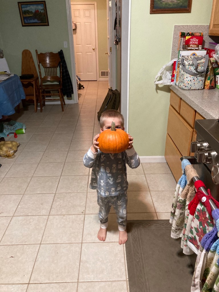 Monday morning, bright and early, he brought his pumpkin upstairs from the garage, to make pumpkin something. Right now.