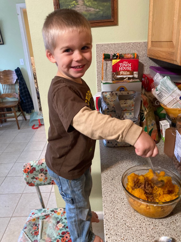 Seppi did not like not being able to scrape out the hot pumpkin after it came out of the steam bath. He insisted he was big enough, but Daddy disagreed. He was allowed to stir the pumpkin spice into it, and that was a decent consolation prize.