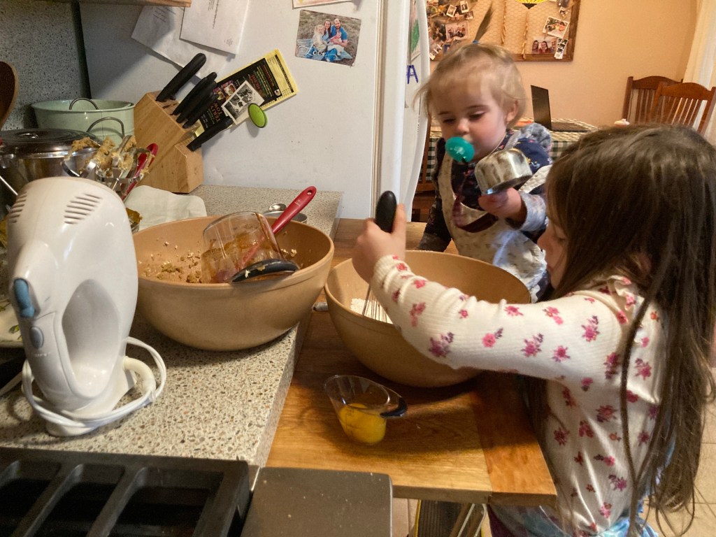 If it looks a bit chaotic, like Winnie is about to climb right onto the cutting bord and dip her measuring cup into the bowl, that’s because that is exactly what is about to happen.