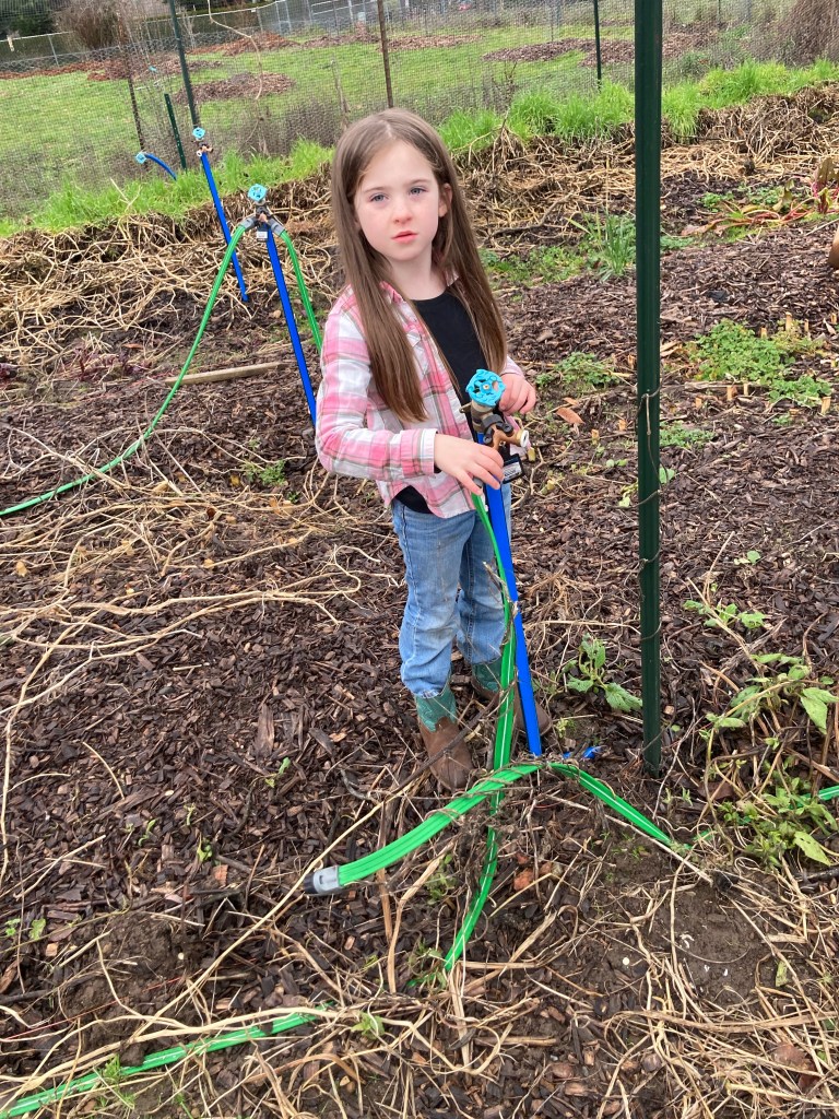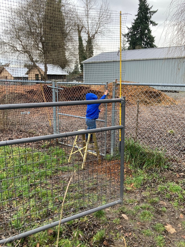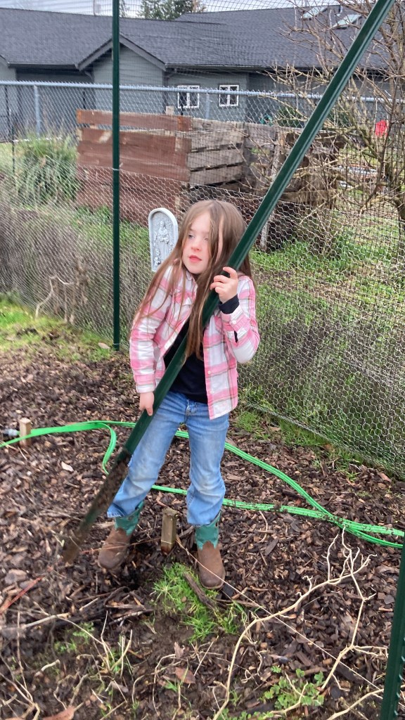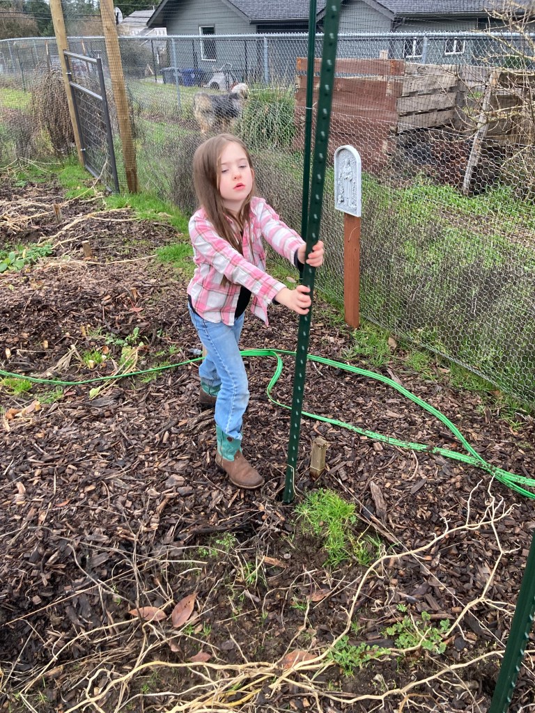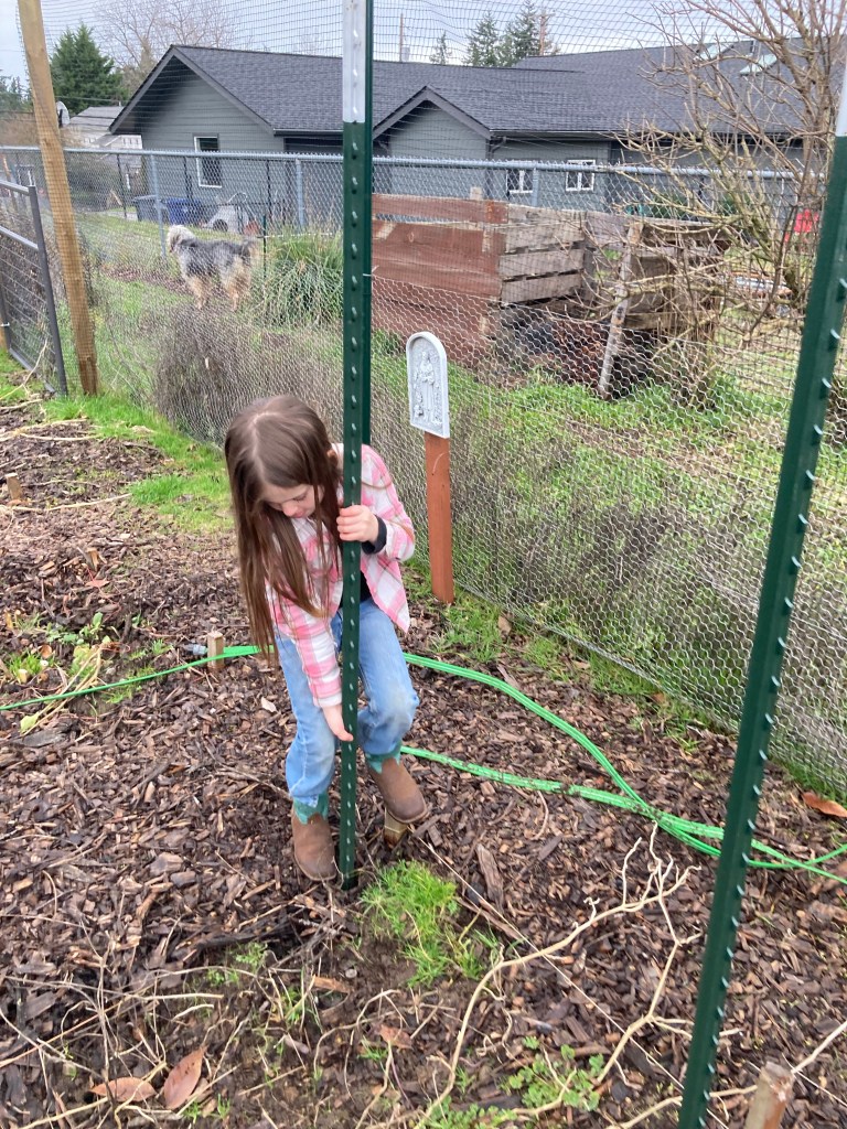 Now that the ground is soaked and loosened up, Ellie can pull the posts out of the ground (mostly) by herself.