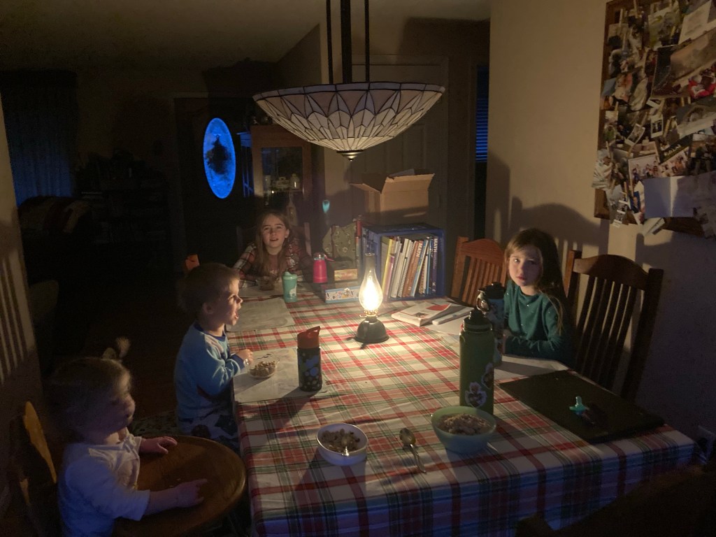 On a more serious note, this did cause us to identify some potential gaps in our preparedness, which we can begin to work on for future events. It was not just a fun day pretending “Laura Ingals.” Of course, the electricity came back eventually, only because of people working hard all day in the cold, wind and rain, so many thanks to them.