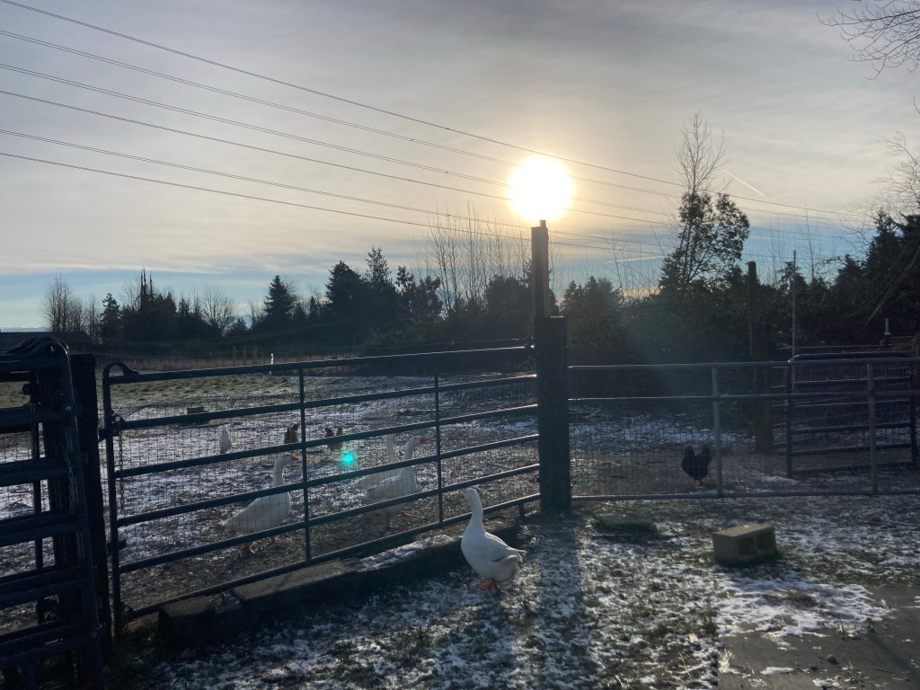 At 20 degrees, the chickens and geese still happily wander around the pasture, although the small goose somehow got separated from her posse. Of course the chickens can’t scratch for bugs or worms, because the ground is frozen, so they need extra rations. The geese end up taking over the chicken house, because they are selfish, snobby feather-snakes, but we only have two heated water bowls so we have to let them in there to get water.