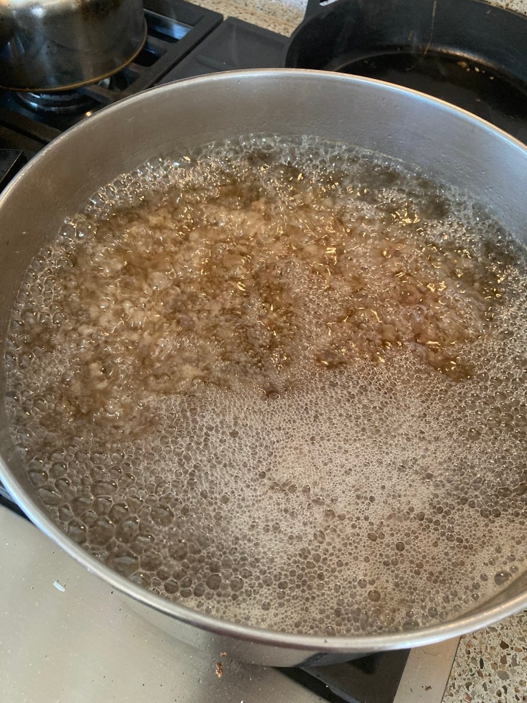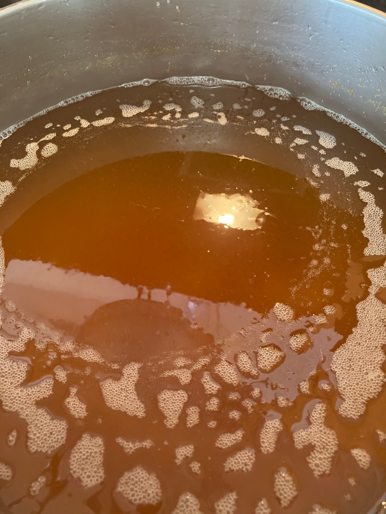 Once the pot is full and the fat has come to a boil (it takes about 20-30 minutes) it is turned to a simmer. After a few minutes you can begin to strain out the cracklings. These are bits of meat, fascia and other impurities that are in the raw fat, which are now essentially deep fried shreds of pig. In “Little House” Ma preserved these and used them as flavoring in corn bread. We decided this was a bridge too far for this time around and put them in a bucket to feed to the chickens.