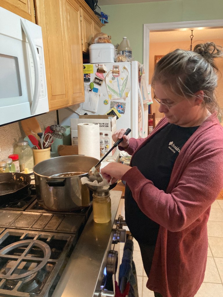 The cheesecloth strains out the smallest impurities so that what goes into the jar is as close to pure as we can get it.