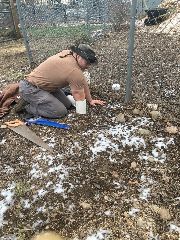 He got it cut low enough so he could barely reach the valve with his fingertips and turn it off. So now we can turn water back on to the rest of the farm. The access pipe doesn’t have a cap at this point so we covered it with a bucket until we can get one put in.