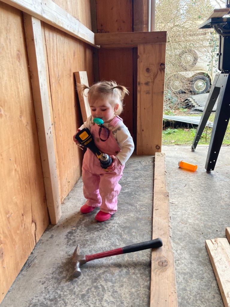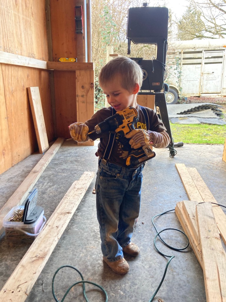 Still working on putting a work bench in the shop. IT’s kind of a nooks and crannies project, meaning something we can work at a few minutes here, a few minutes there, and the kids can help.
