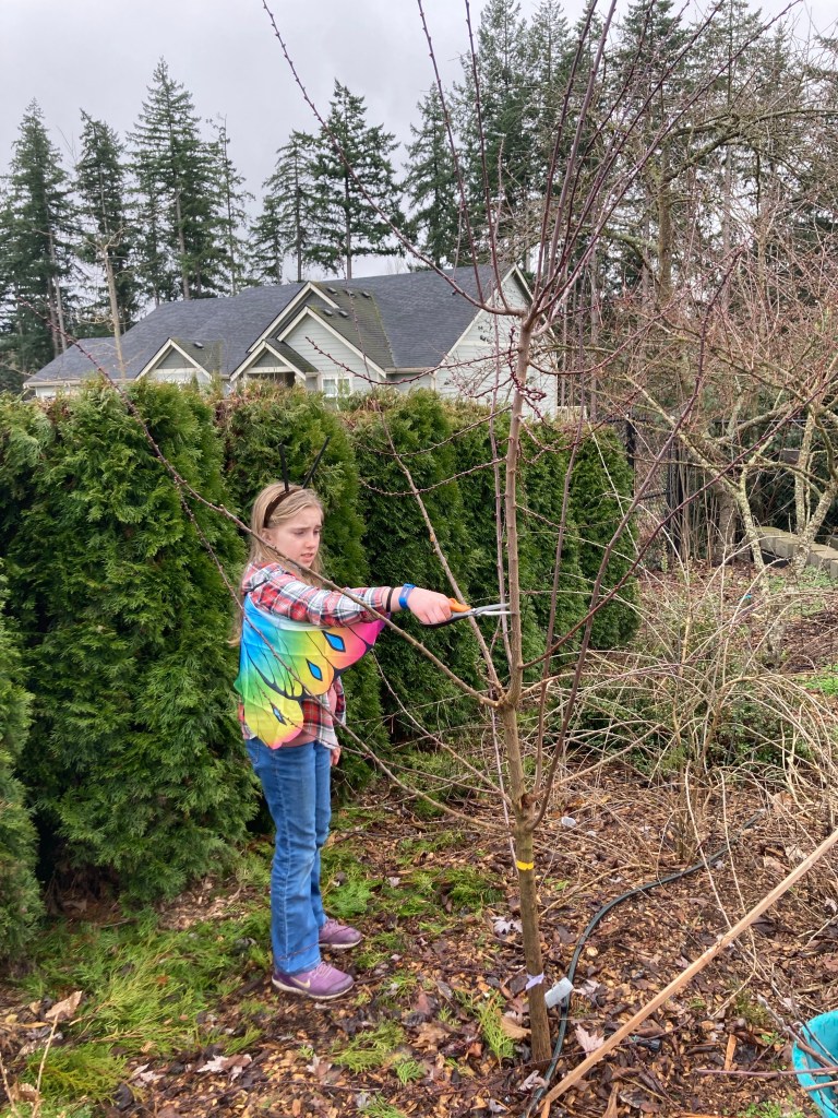 Evie is old enough to help this year, which is greatly appreciated, on days when she finishes her school in time to help. Here she is pruning our hollywood plum.
