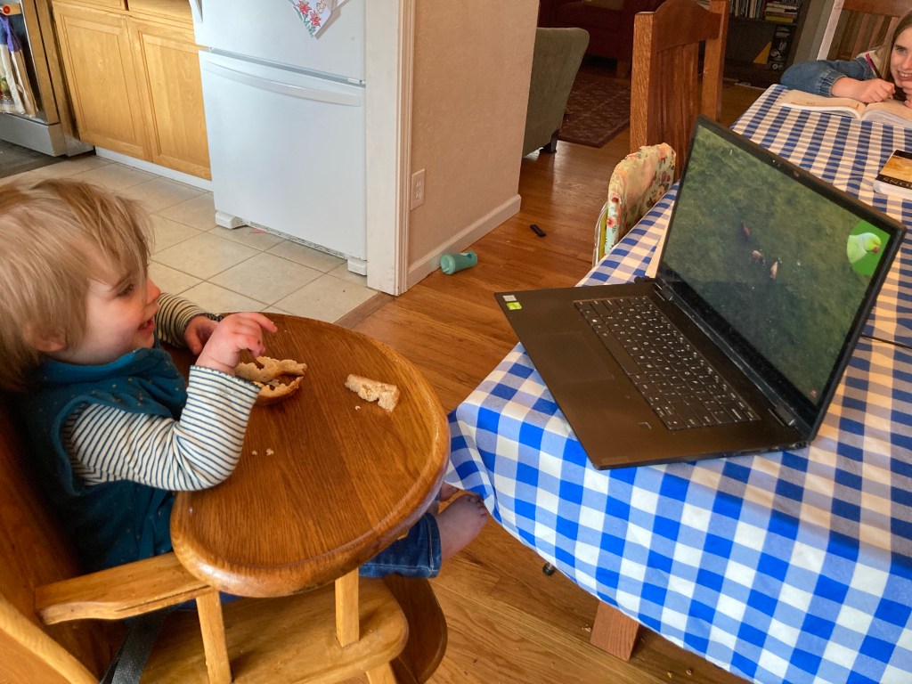 After a hard morning’s work, Winnie revived with some bread and butter, and her favorite show (watching cows mooing on youtube).