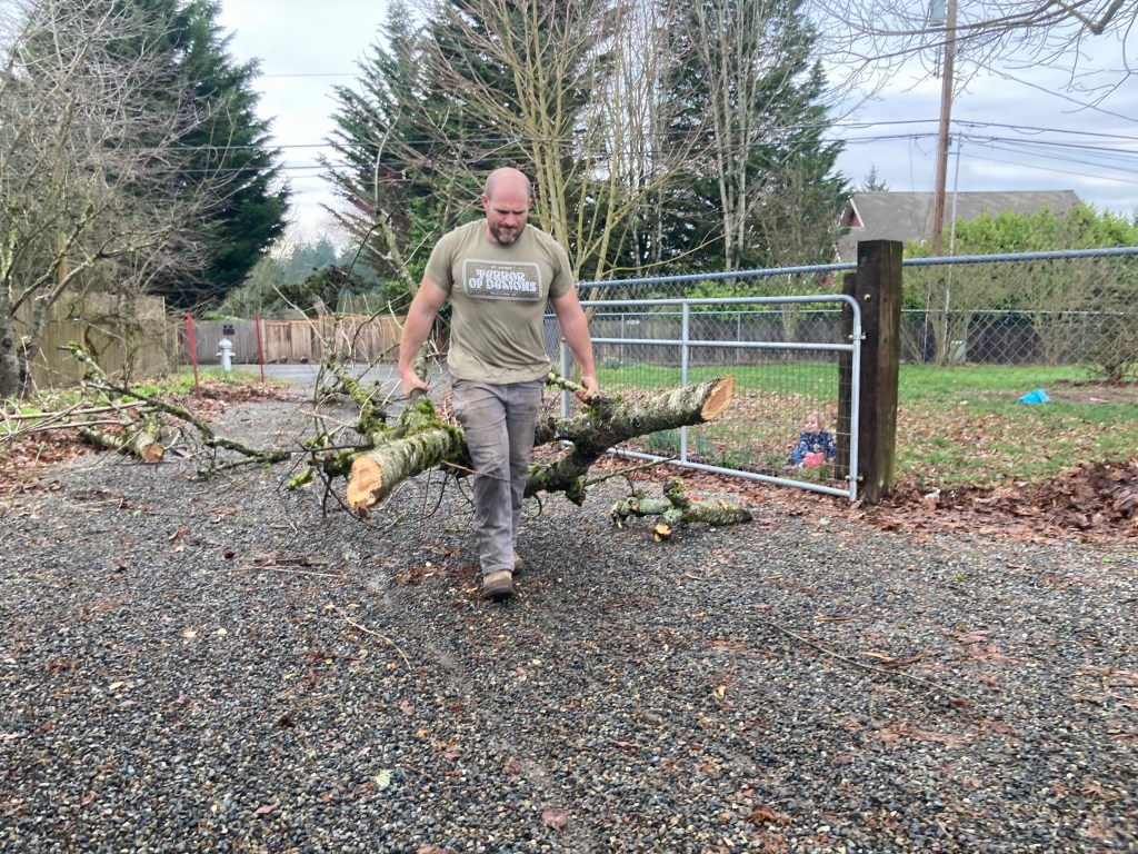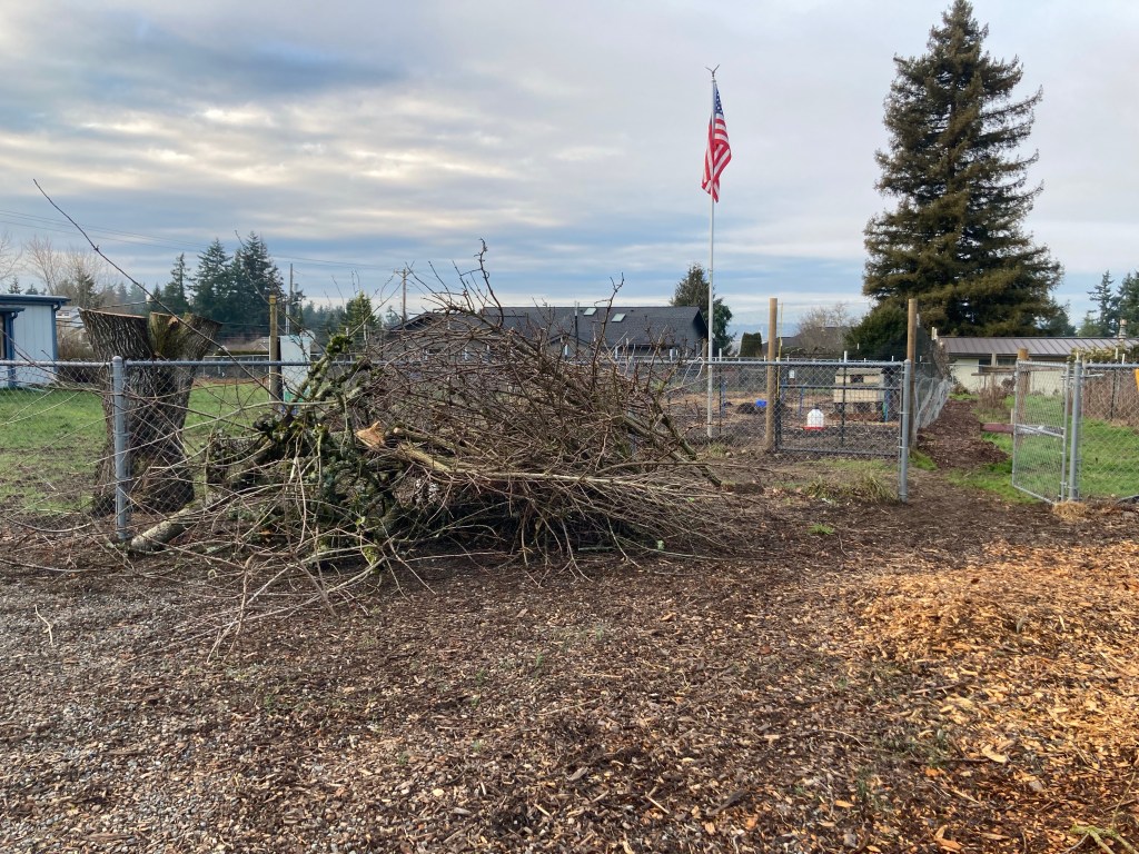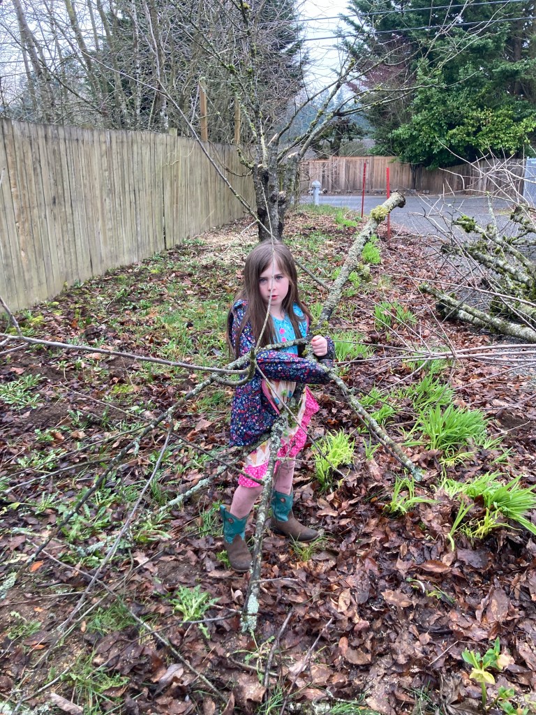 So now we have a big pile of cherry and elderberry brush, which will be a bonfire eventually, but in the meantime makes a good play spot for the kids.