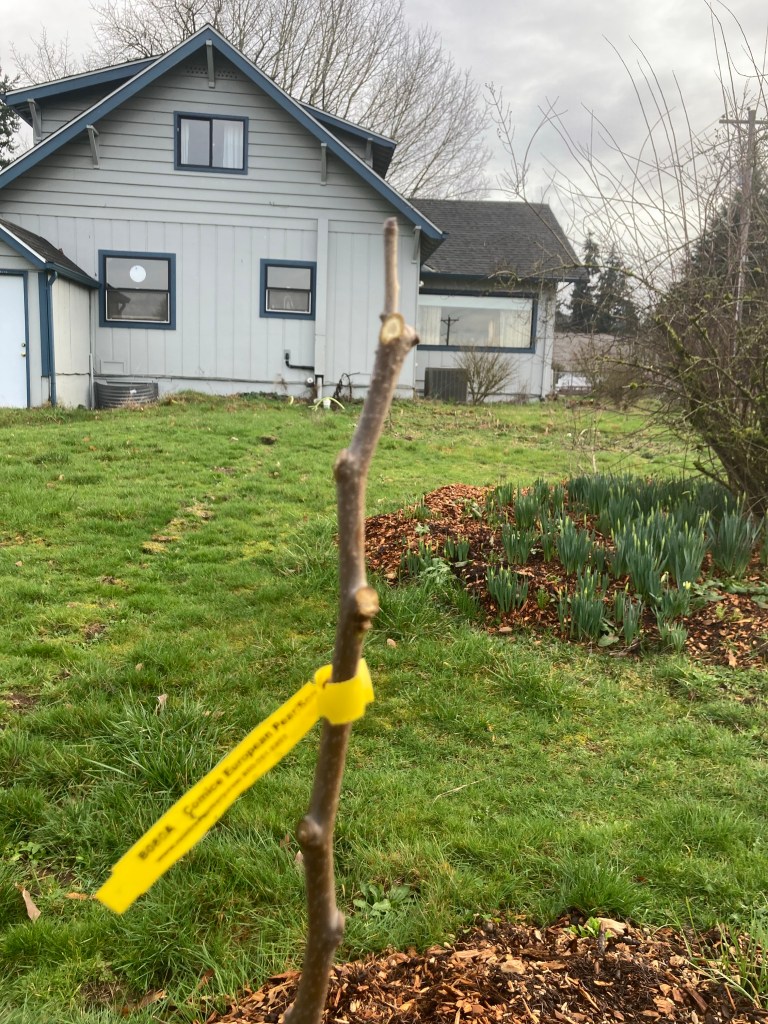And finally the Frequin Rouge Cider apple, (a.k.a., the Freakin’ Rogue!) another dwarf, only two small laterals really declared themselves but there are some promising buds above and below that might shoot out to form a nice little first tier, and the leader is not bad looking.