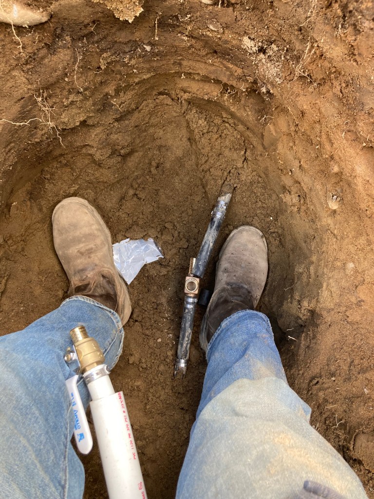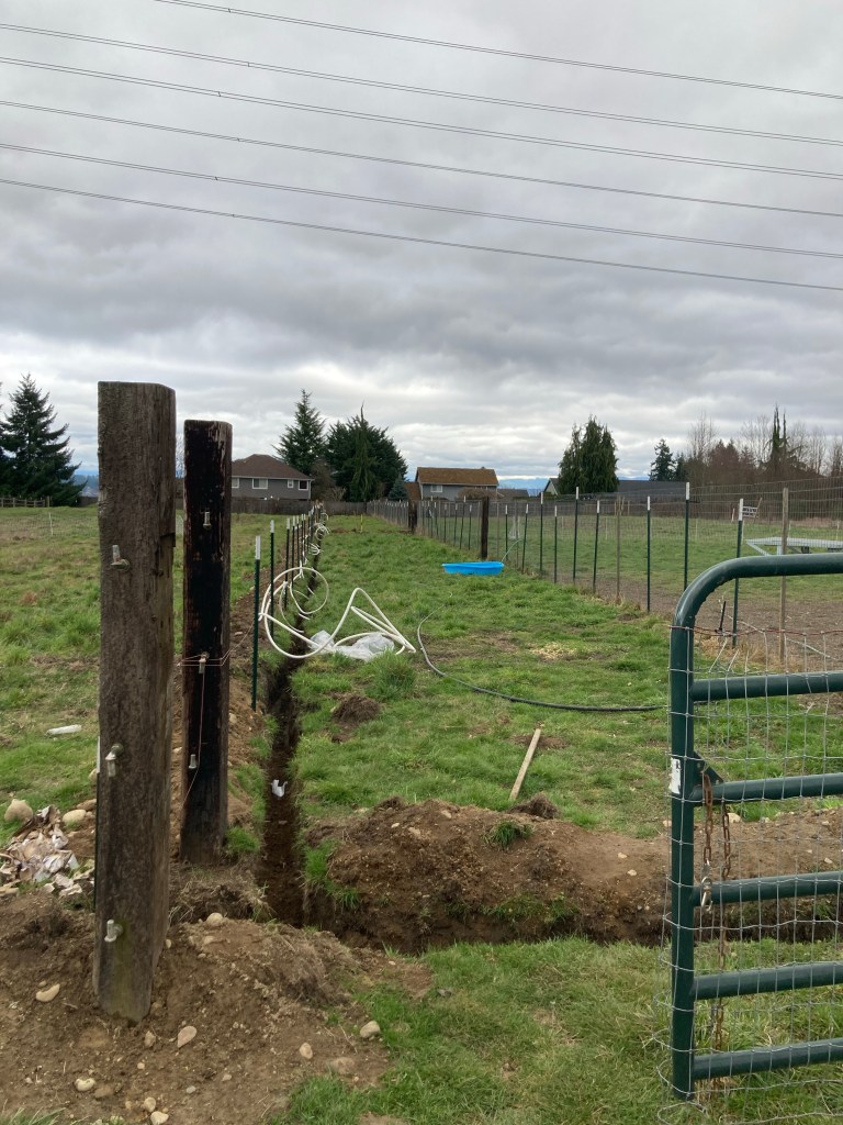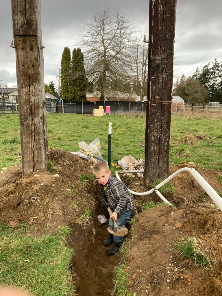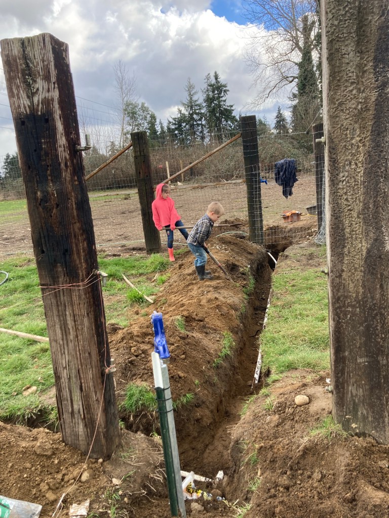Then into the conduit and out to the pasture. We did not have time to test it because the weather turned windy and the tenp dropped down to the low 30’s with hail. The kids were pretty much over it, and it was supper time, so we headed home.