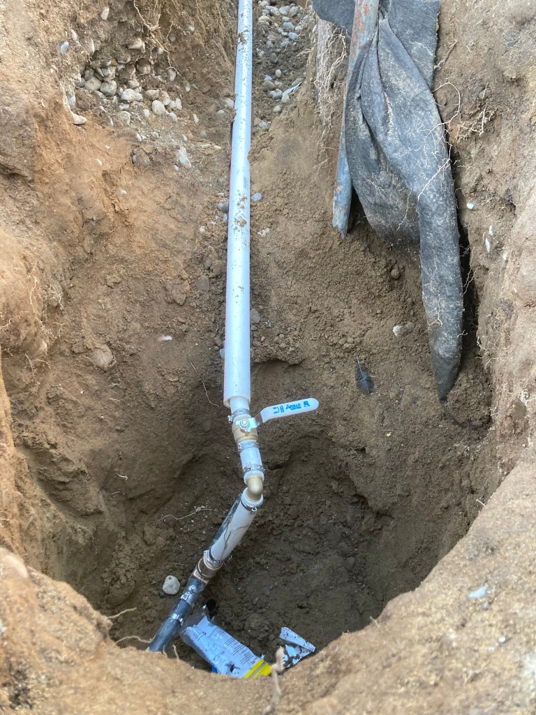 Then we cleaned out the trench a little bit to even the grade and remove the river rocks. It was all for nothing, of course, the previous owner had buried a water line under that area, covered it with river rock and covered that with landscape cloth. There was no way to get that hump lower or to get the rocks completely removed, so for that section we opted to run the pex pipe through 1 1/4 PVC conduit to protect it from the rocks.