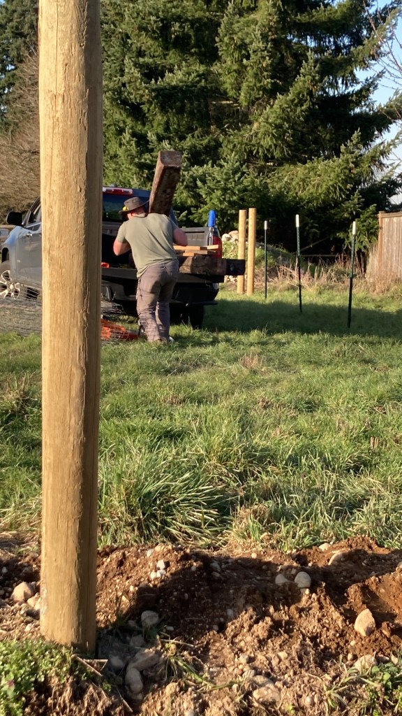 We put the upper portions of the railroad ties in the bed of the truck and stowed them in the car port with the rest of the fencing supplies, along with the role of horse fence.