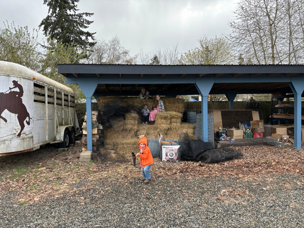 While Daddy moved dozens of wheelbarrow loads of wood chips for the pathways, it started raining pretty hard, so the kids played fort on the strawbales under cover. Seppi was the guard.