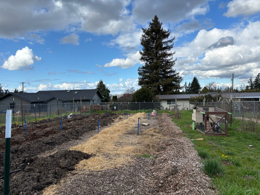 Lasagna beds taking shape. (Lasagna beds refers to a technique of using a paper or cardboard ground layer to suppress weeds, and then piling layers of nitrogen rich [chicken manure] and carbon rich materials [straw and old bedding hay] on top of it, and then covering that with a layer of dirt or top soil). Our “soil” is the dirt from the walkways which is last year’s wood chips, which have had a year to be pooped on by chickens, rained on, mixed in with dirt and inhabited by earthworms. It is not as fine as we would like it, but it will do for this year. Next year, God willing, we will top it with a layer of screened compost.