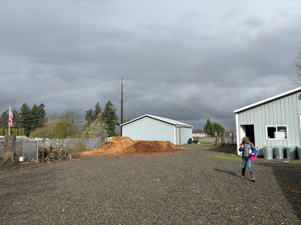 The rain is passing, and the sun is breaking through in the west. To the east, a rainbow.