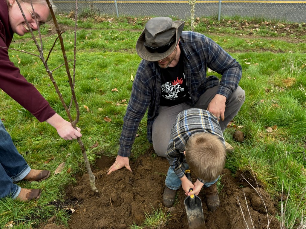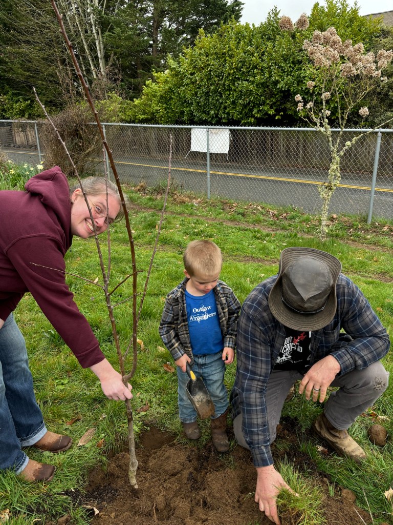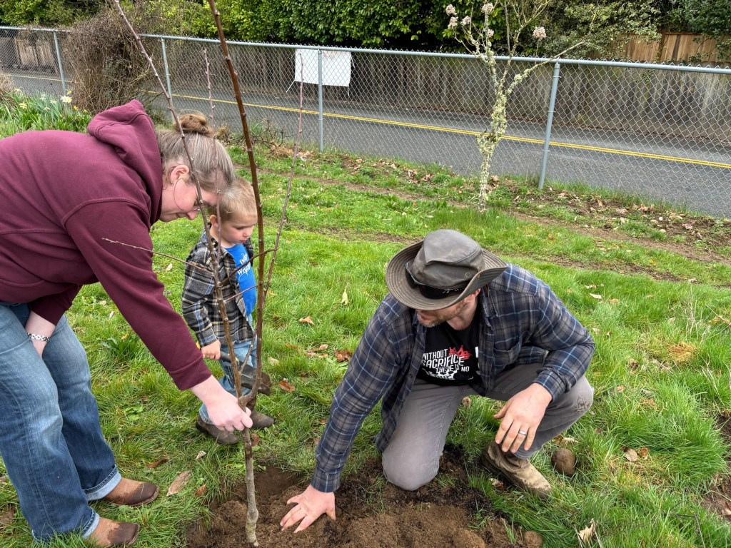 We had a coupon for $30 each off the price of up to three trees from a local nursery, so after work and homeschool co-op we all piled in the car and drove down to pick out and pick up some trees. This turned out to be an error in judgement as the trees were two-year-old potted trees (only slightly root bound) and too tall to fit in the car, so the men (Daddy and Seppi) had to go back to get them with the truck.