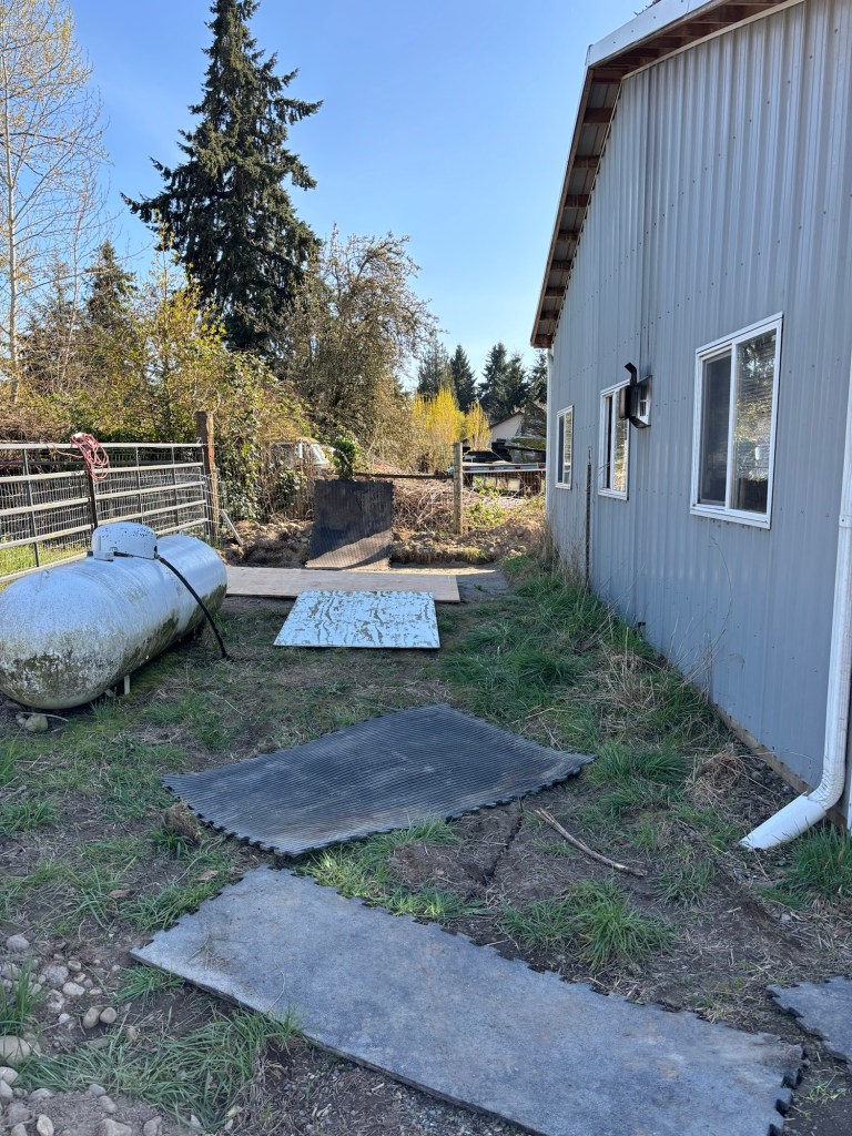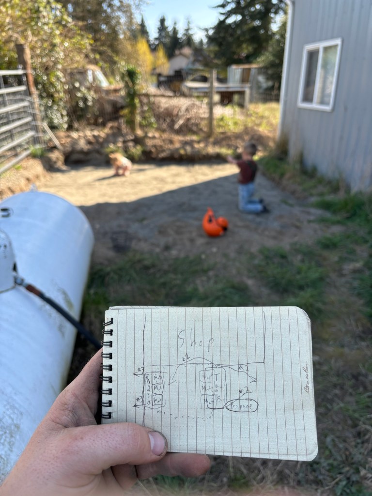 So Ryan and Adam spent a good chunk of the afternoon planning out exactly how we were going to get a 700lb tank in place between the barn and the pole barn without damaging themselves or any other important infrastructure.