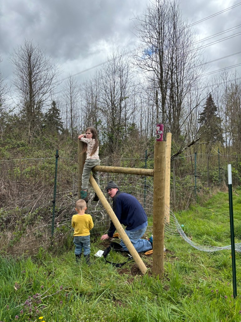 As always, the first step was rolling out the wire. Here our two smallest farm hands did all the work themselves, while the grownups merely hovered over to make sure no little fingers were pinched.