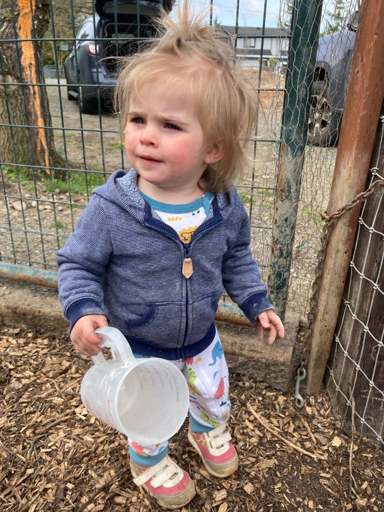 Yes, she is feeding the baby chicks in her jammies. She threw up her breakfast (yogurt) and the smell was such that we felt she needed to change. Jammies were what we had on hand, so, jammies it was.