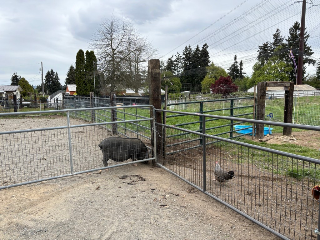 The gate to the pig yard closes with a 1/4″ – 1/2″ gap.