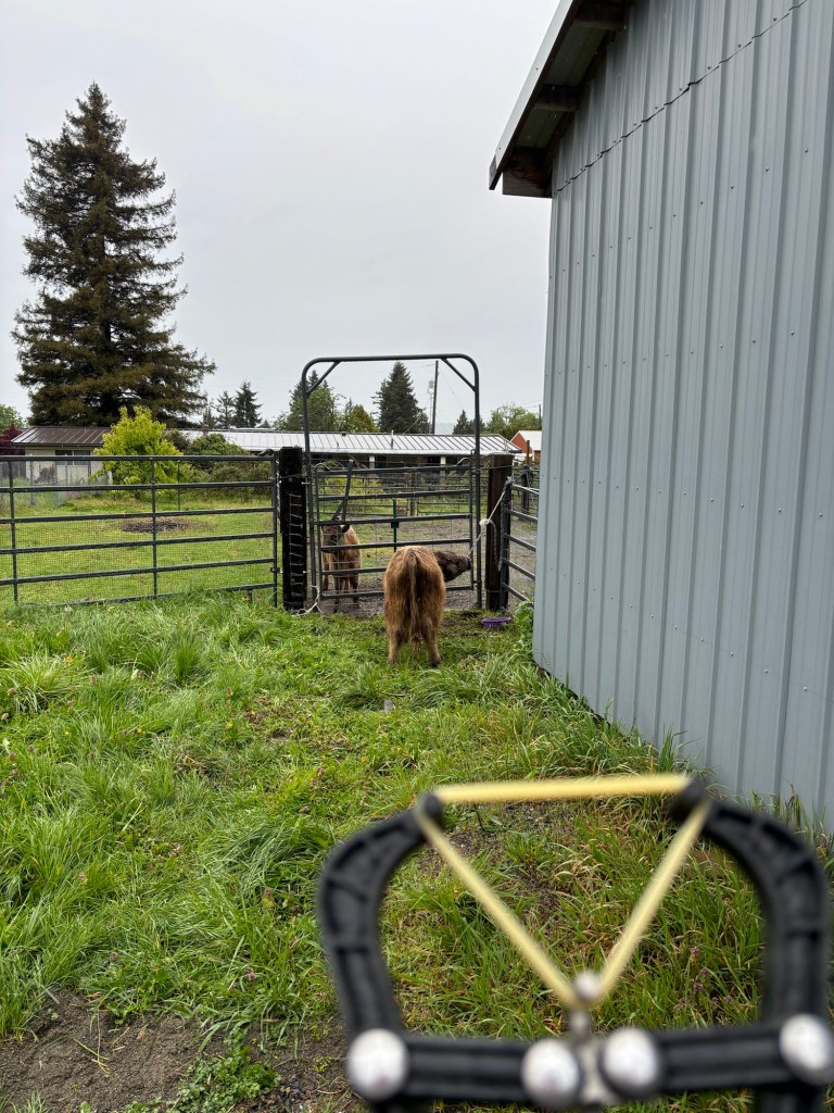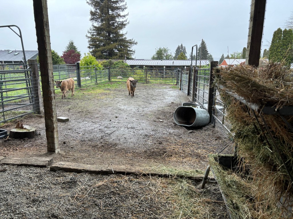 There’s an old adage that says something like: “You get what you pay for.” That holds true for these guys. Nothing wrong whatsoever with their breeding and lineage and form. Their sire was a registered Highland bull, and their mother was some combination of Highland-Angus, both respectable beef breeds. They favor the highland side, short, stocky, thick limbed with broad hooves and shaggy brown coats. One is 5 months old, the other 7 months old, which means they should be ready to butcher sometime in October of 2025. Highlanders are hardy, hands-off cattle that do well on pasture with minimal input.